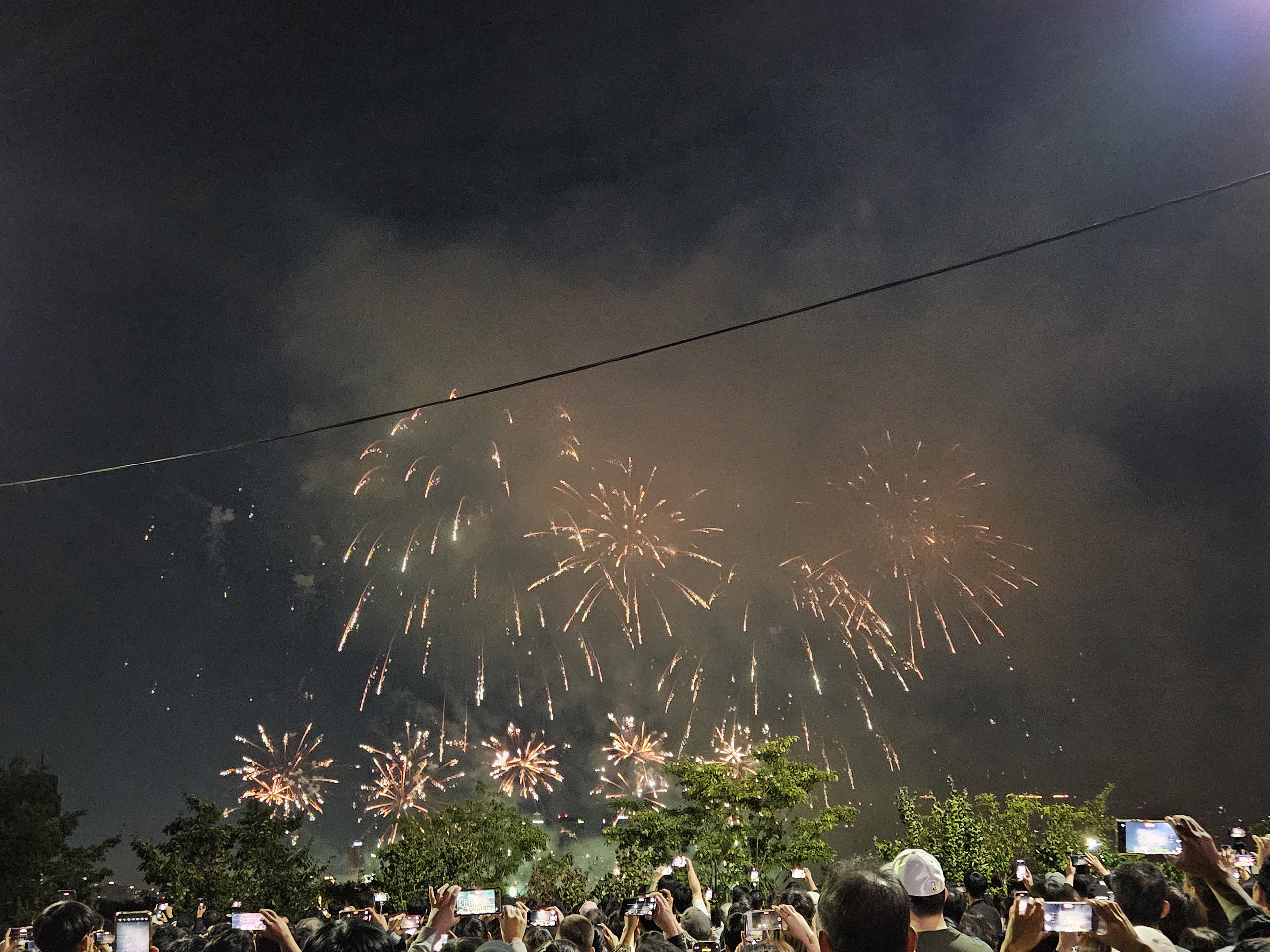 가장 특이했던 점은 원효대교와 한강철교 사이, 원효대교와 마포대교 사이에서 같은 불꽃을 동시에 터뜨리는 '쌍둥이 불꽃'이 터졌습니다.