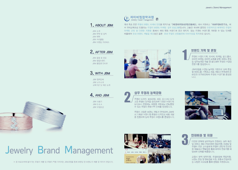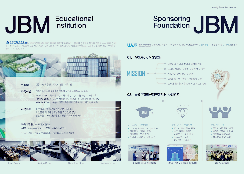JBM과정은 Jewelry Brand Management의 약어로 주얼리 브랜드 창업을 원하는 분들을 대상으로 1년 간의 하드 트레이닝을 시켜 배출하는 장학과정입니다.
