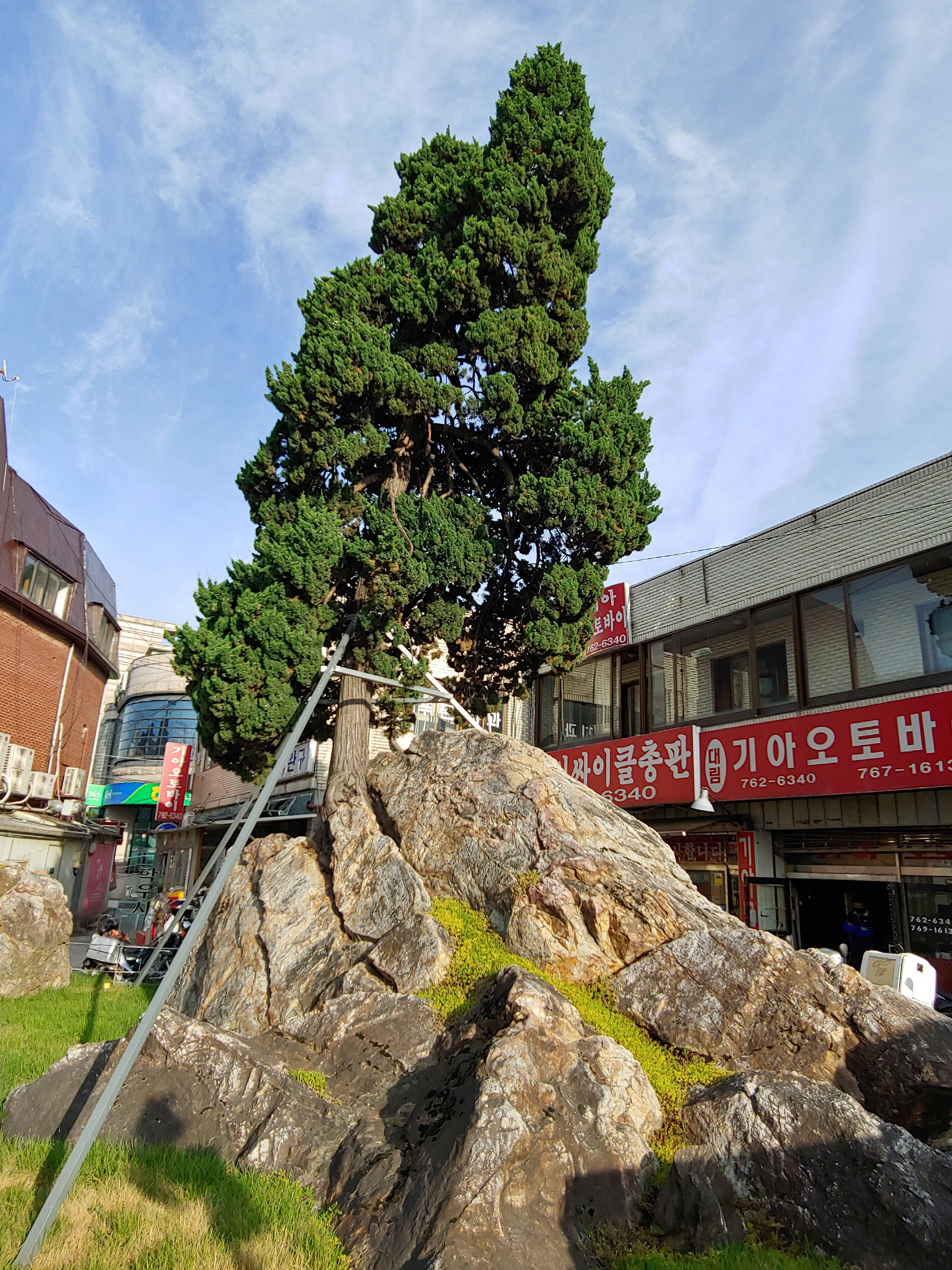 도심에 바위 두 개와 그 사이에 향나무가 자라고 있어 누가 봐도 신기한 모습이라고 생각할 듯하네요.