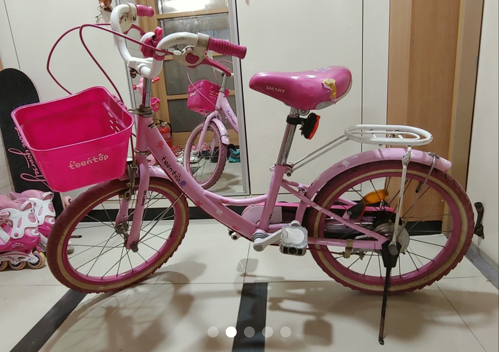 구입할 당시에는 보조바퀴가 달려있었지만, 두 발 자전거를 일찍 마스터하고는 자전거 점에서 외발 스탠드로 갈아 끼웠습니다.