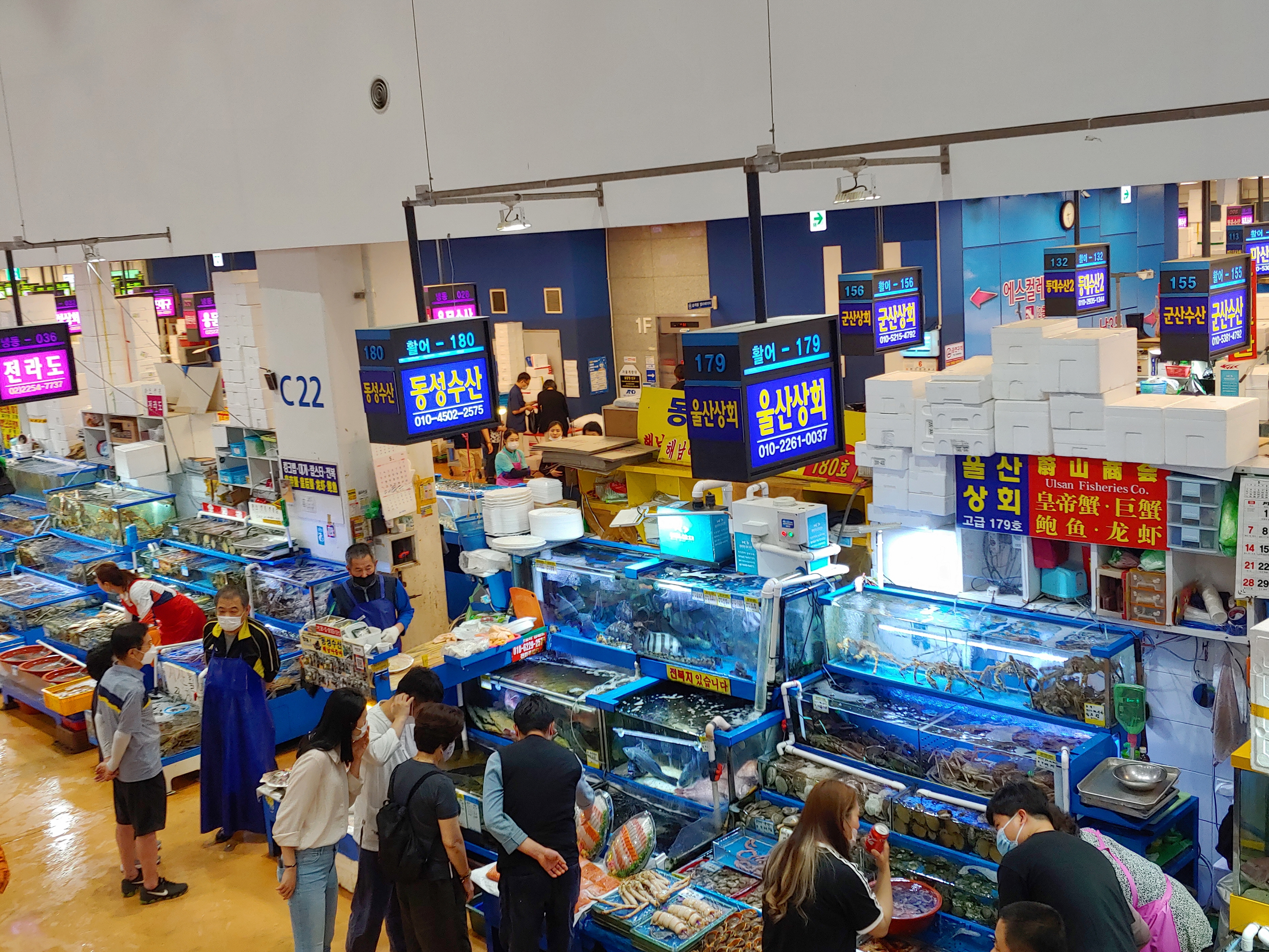 코로나 이전에 왁자지껄하던 수산시장 모습은 아닙니다.