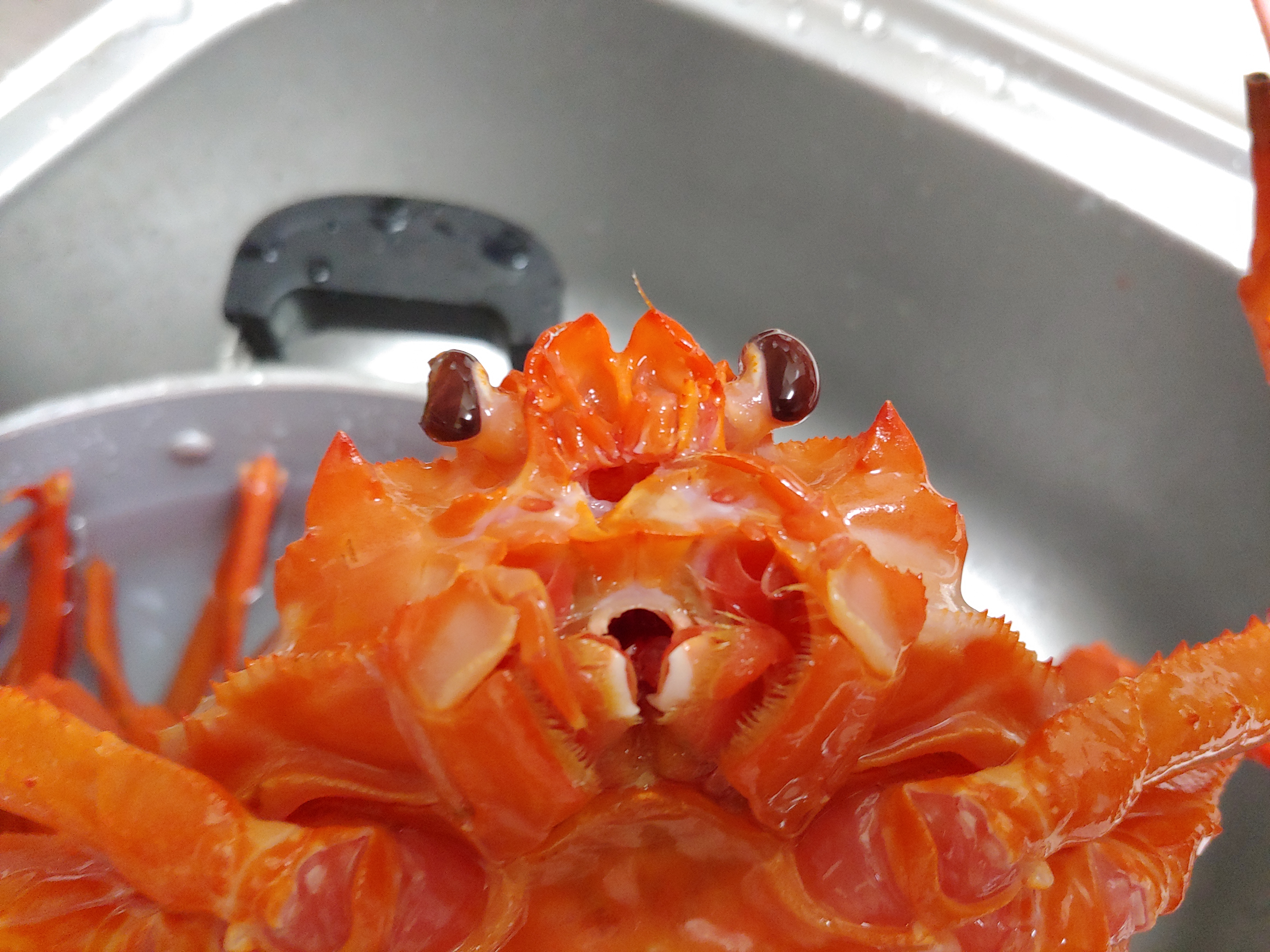 1) 홍게의 입안에 칼을 넣고 옆으로 천천히 젖히면 딸깍 소리가 납니다.