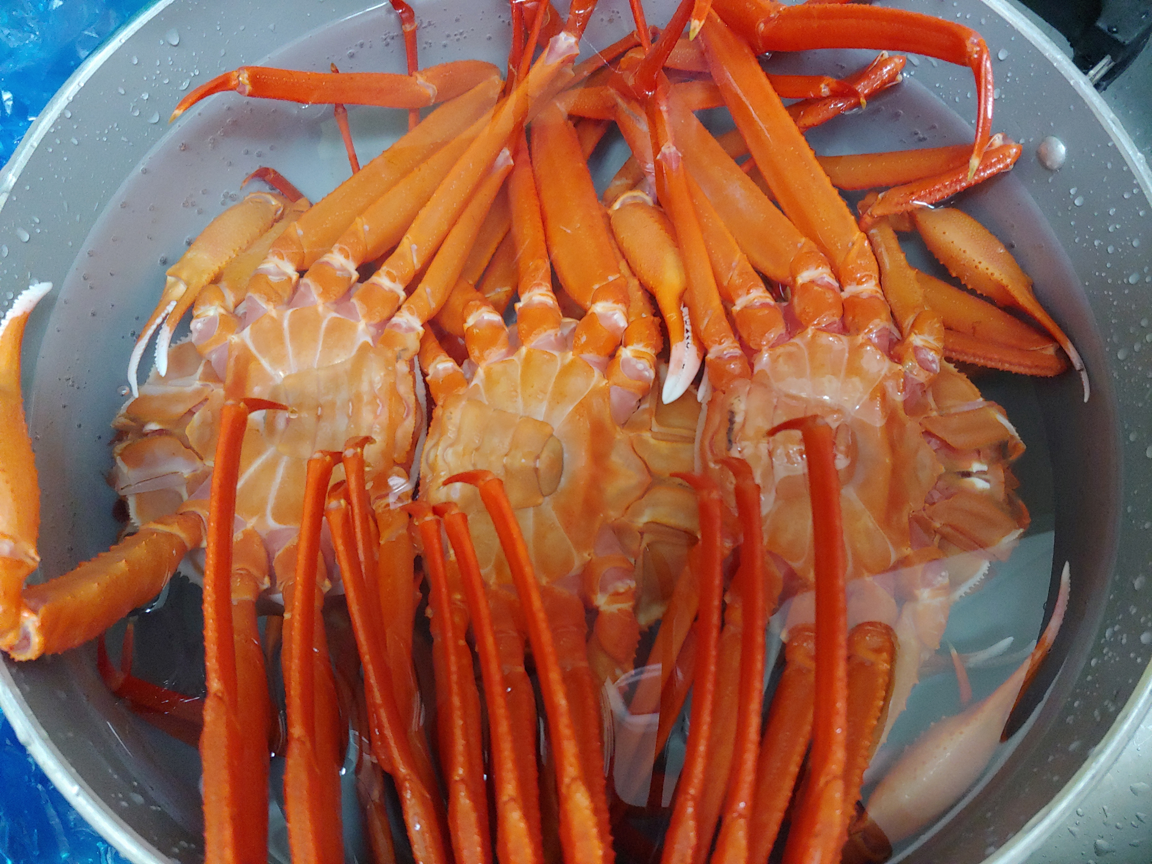 3) 찜통에 채반보다 낮게 물을 붓고 홍게의 배가 하늘을 보도록 놓습니다.