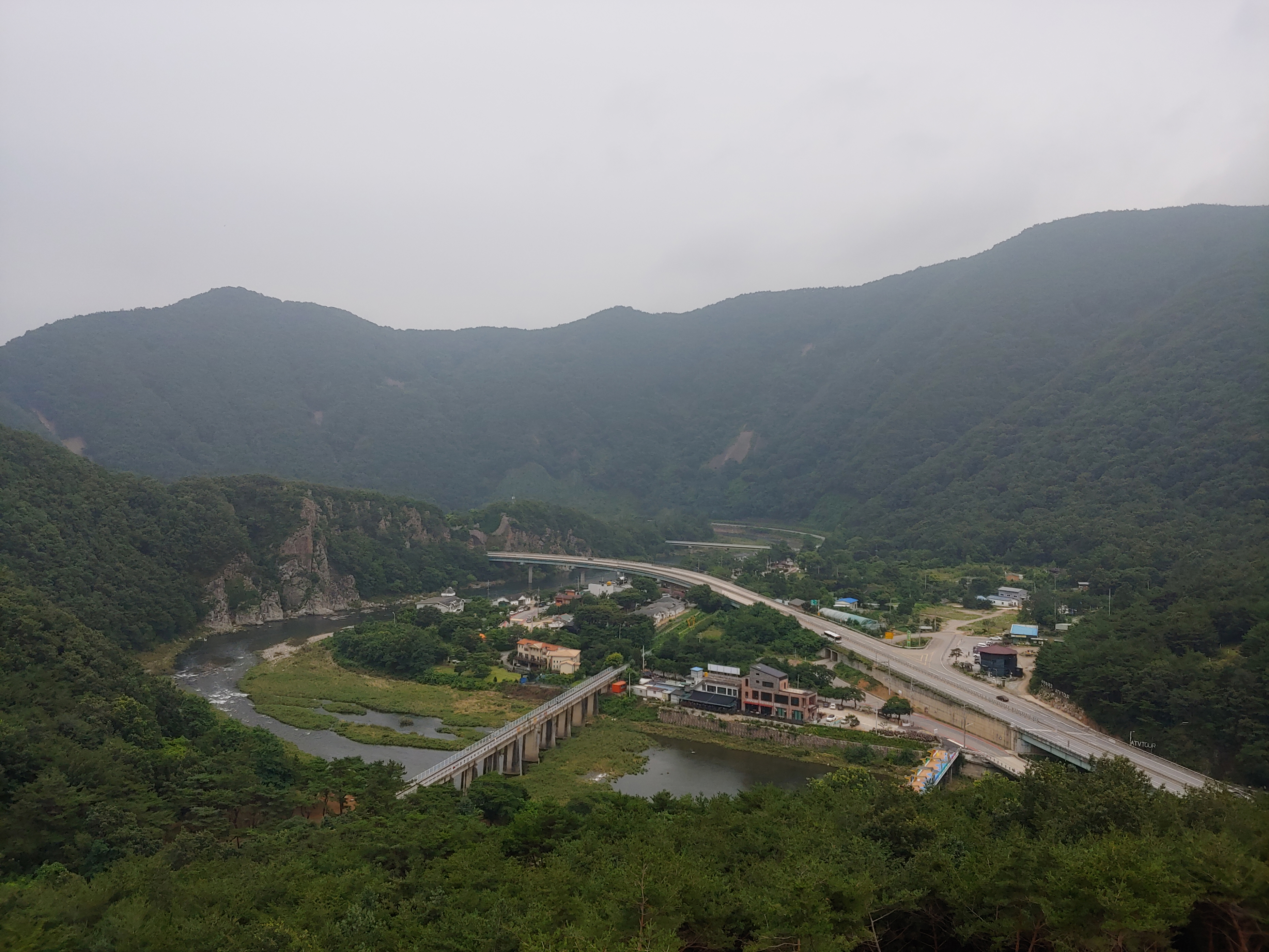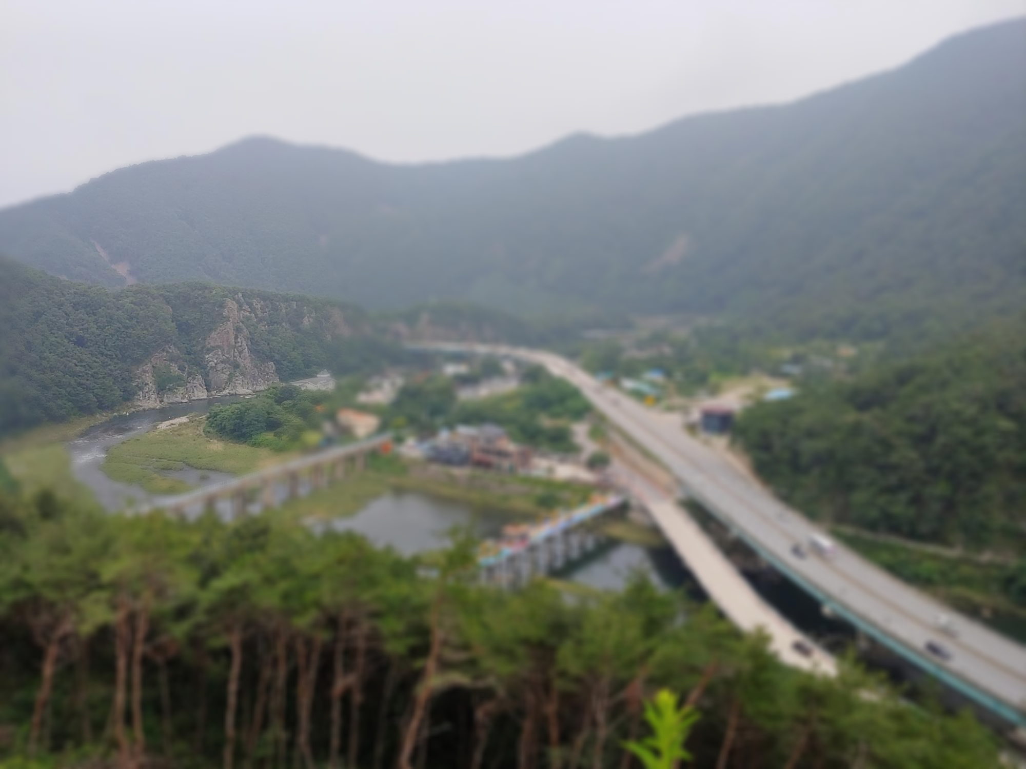 좌측의 영강철교와 우측에 구교인 진남교와 신교인 진남 1교가 있으며, 그 앞에 진남휴게소가 위치하고 있습니다.
