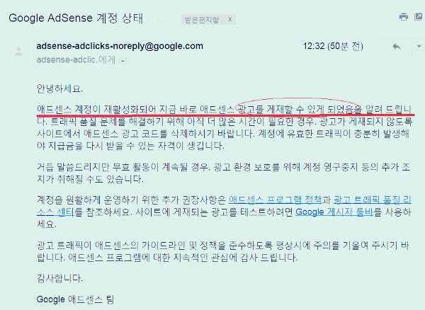 "애드센스 계정이 재활성화되어 지금 바로 광고를 게재할 수 있게 되었음을 알려드립니다."