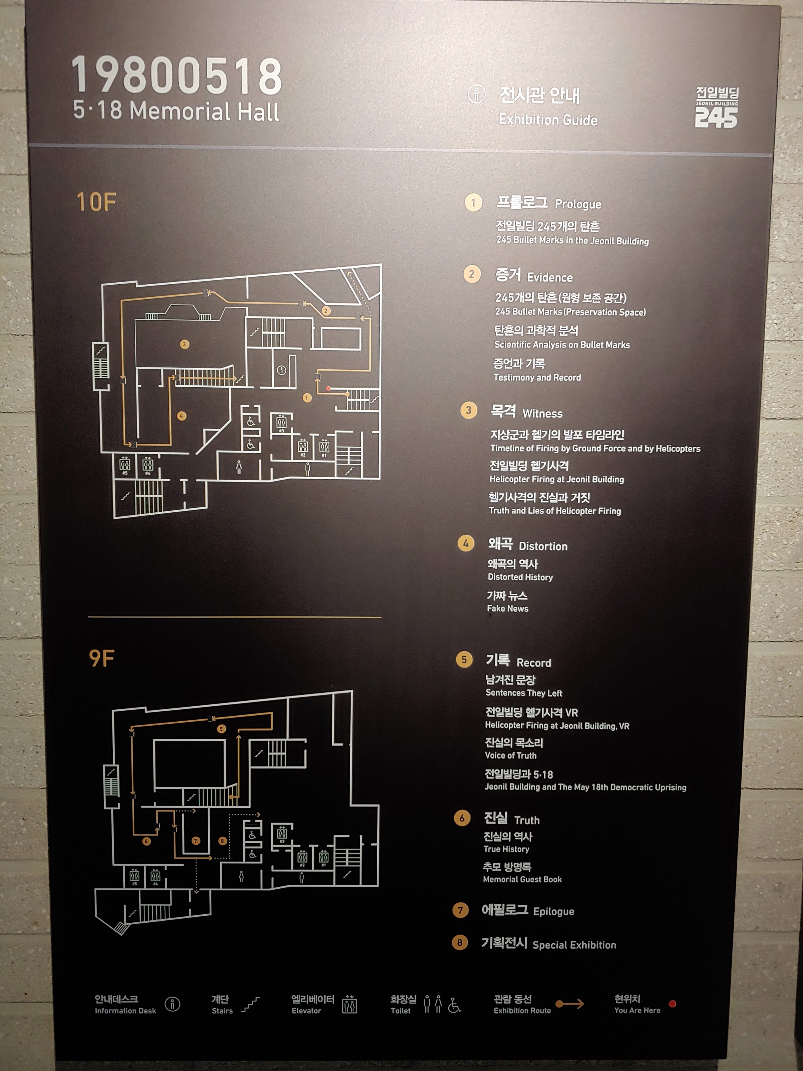 탄흔 245개의 프롤로그, 증거, 목격, 왜곡, 기록, 진실, 에필로그 순으로 전시되어 있습니다.