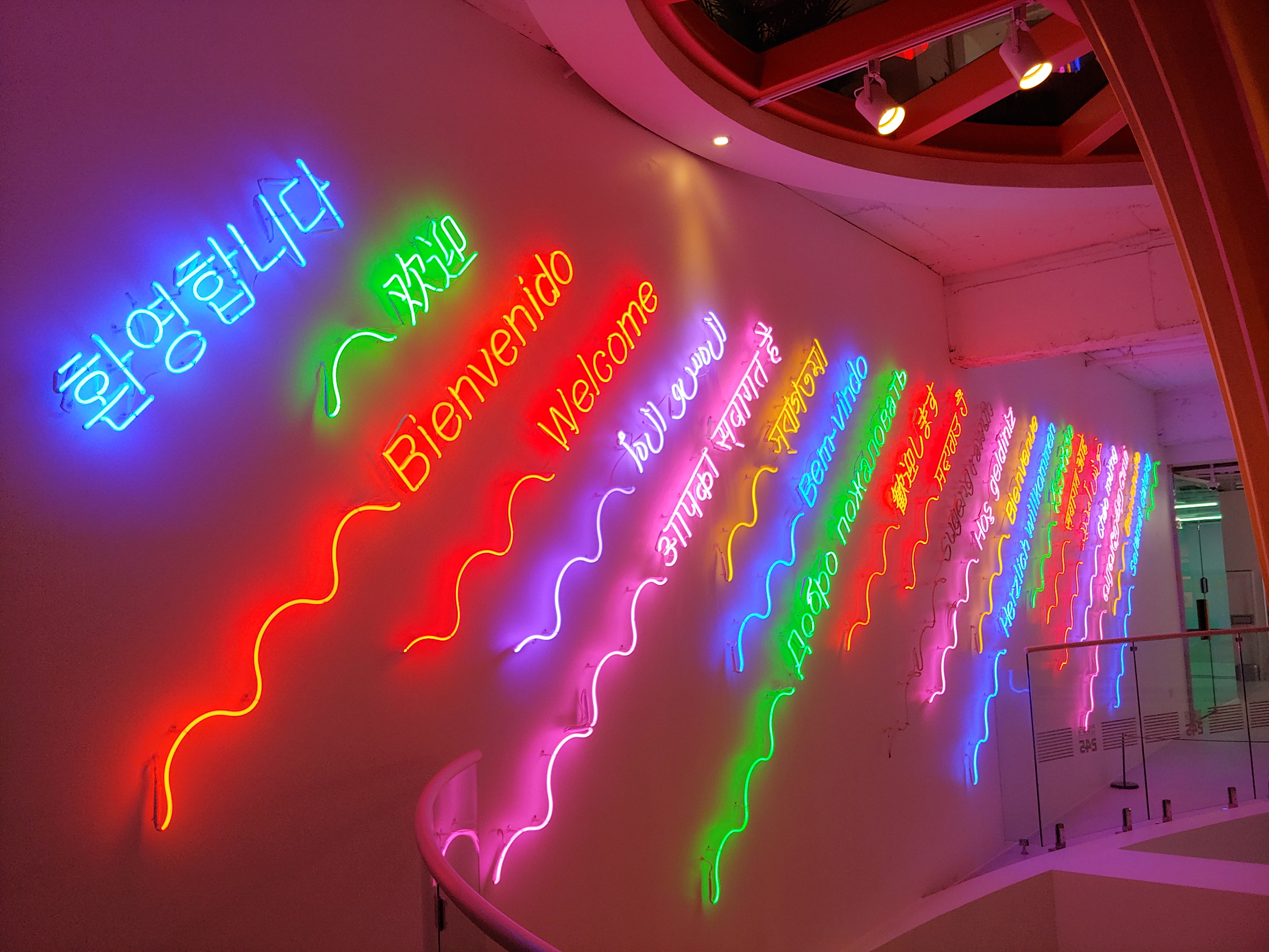 각국의 언어로 환영한다는 멘트가 네온사인으로 빛이 납니다.