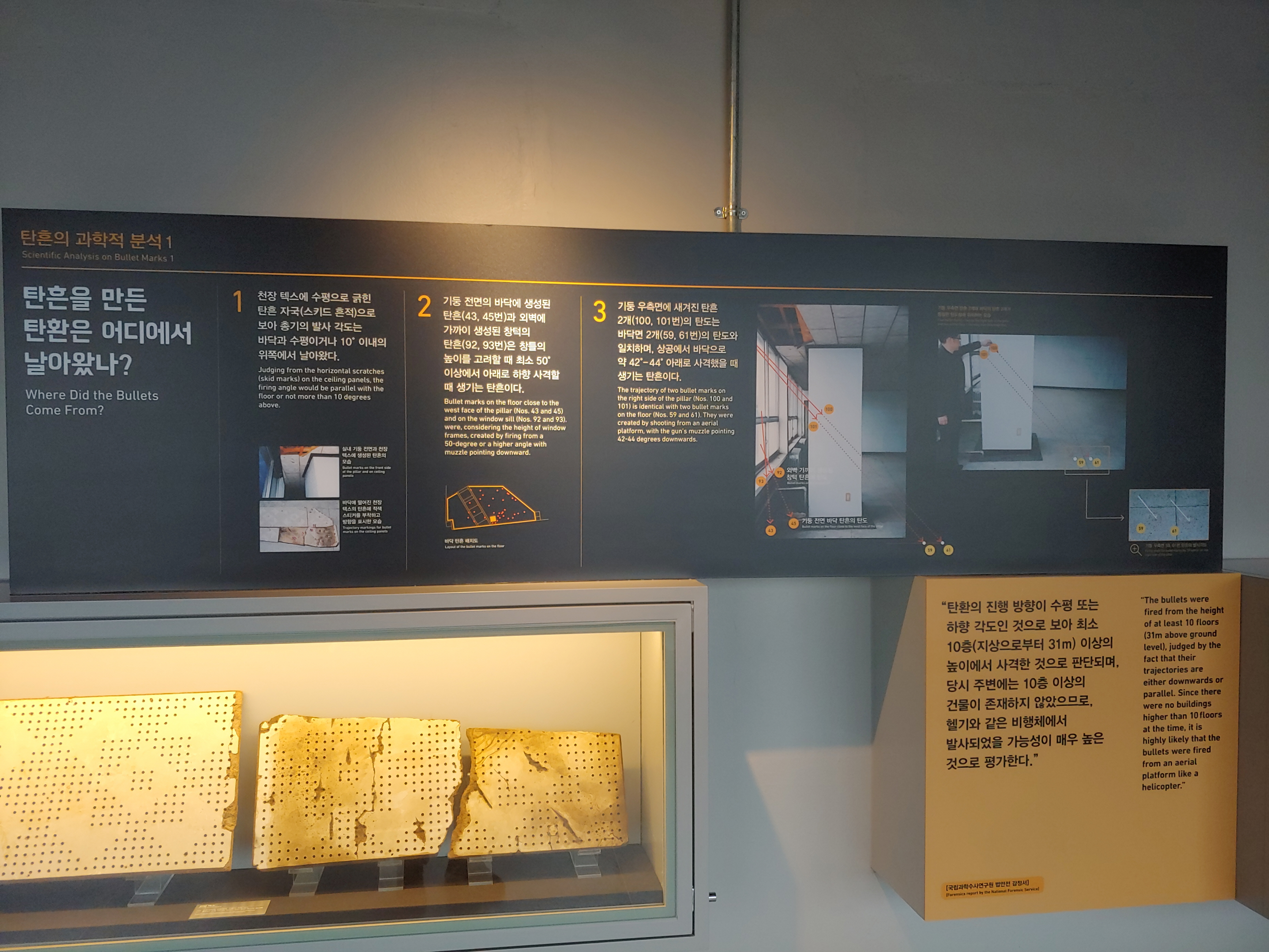이 탄흔은 10층이나 그 이상의 높이에서 쏘았을 때만이 가능한 위치로 판명이 났습니다.