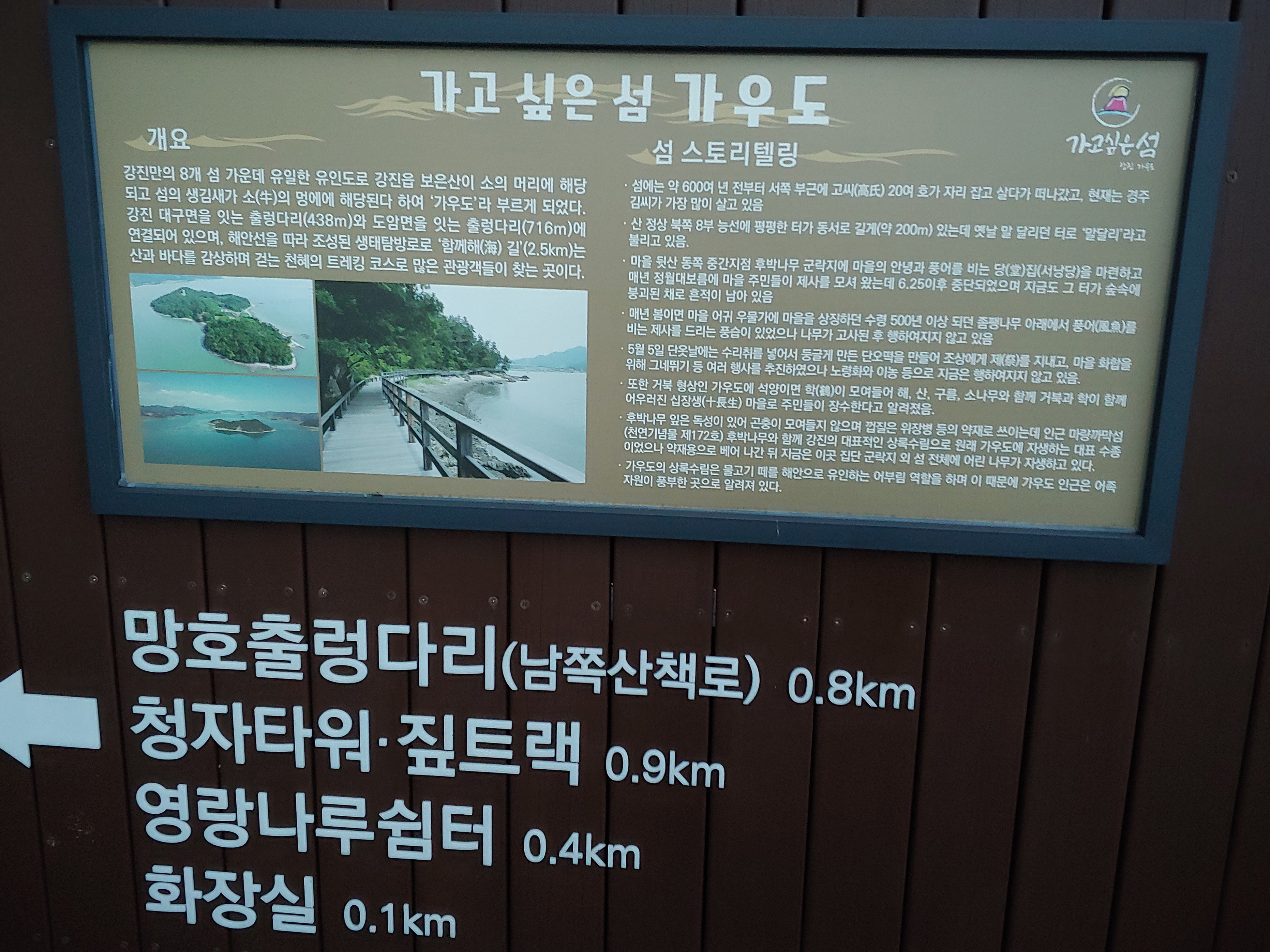 가우도는 강진 대구면을 잇는 저두출렁다리(438m)와 도암면을 잇는 망호출렁다리(716m)에 연결되어 있으며, 해안선을 따라 조성된 생태탐방로 ‘함께해(海)길‘ (2.5km)은 산과 바다를 감상하며 걸을 수 있는 천혜의 트레킹 코스로 많은 관광객들이 찾고 있는 곳이라고 합니다.