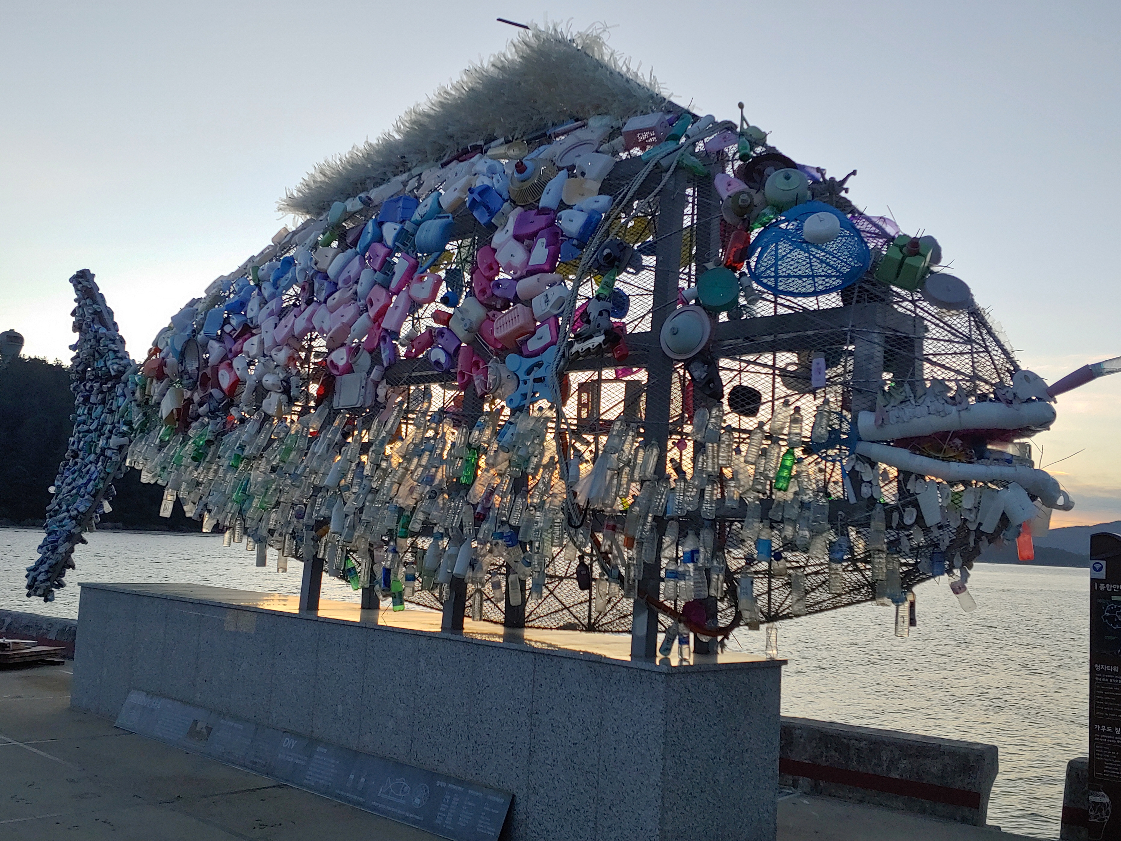 가우도 저두출렁다리 입구에 폐자원을 활용한 물고기 모형이 있습니다.