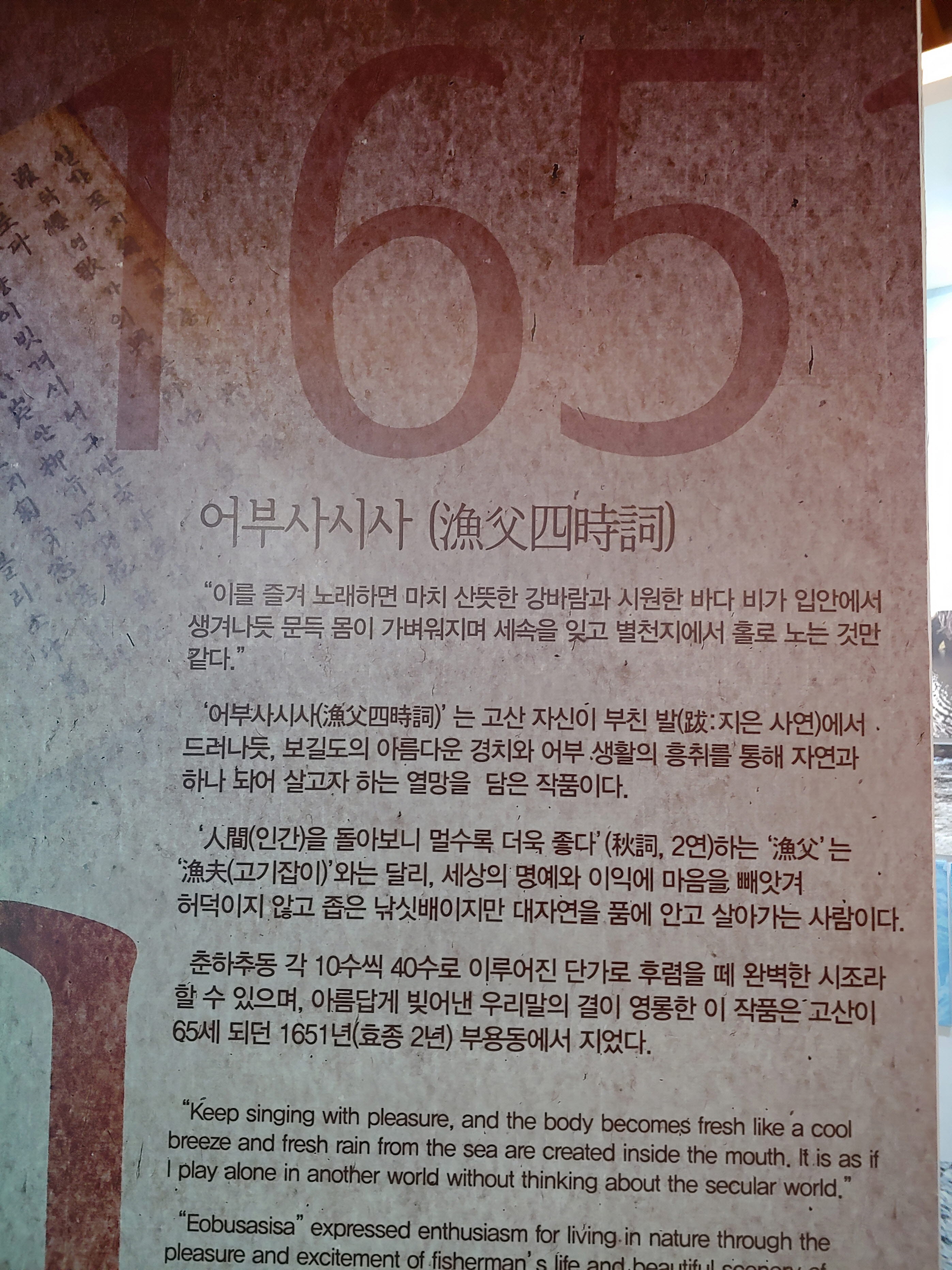 고산이 65세 되던 1651년(효종 2년) 부용동에서 지은 것입니다.