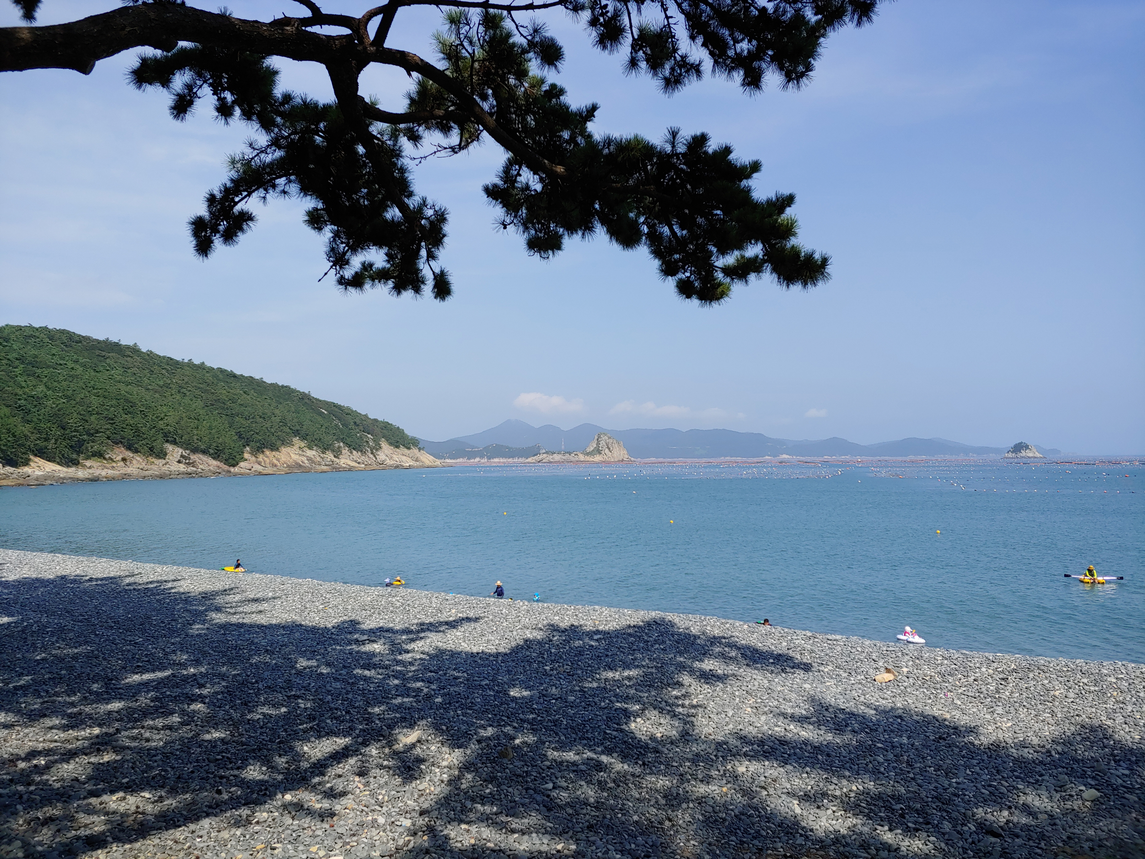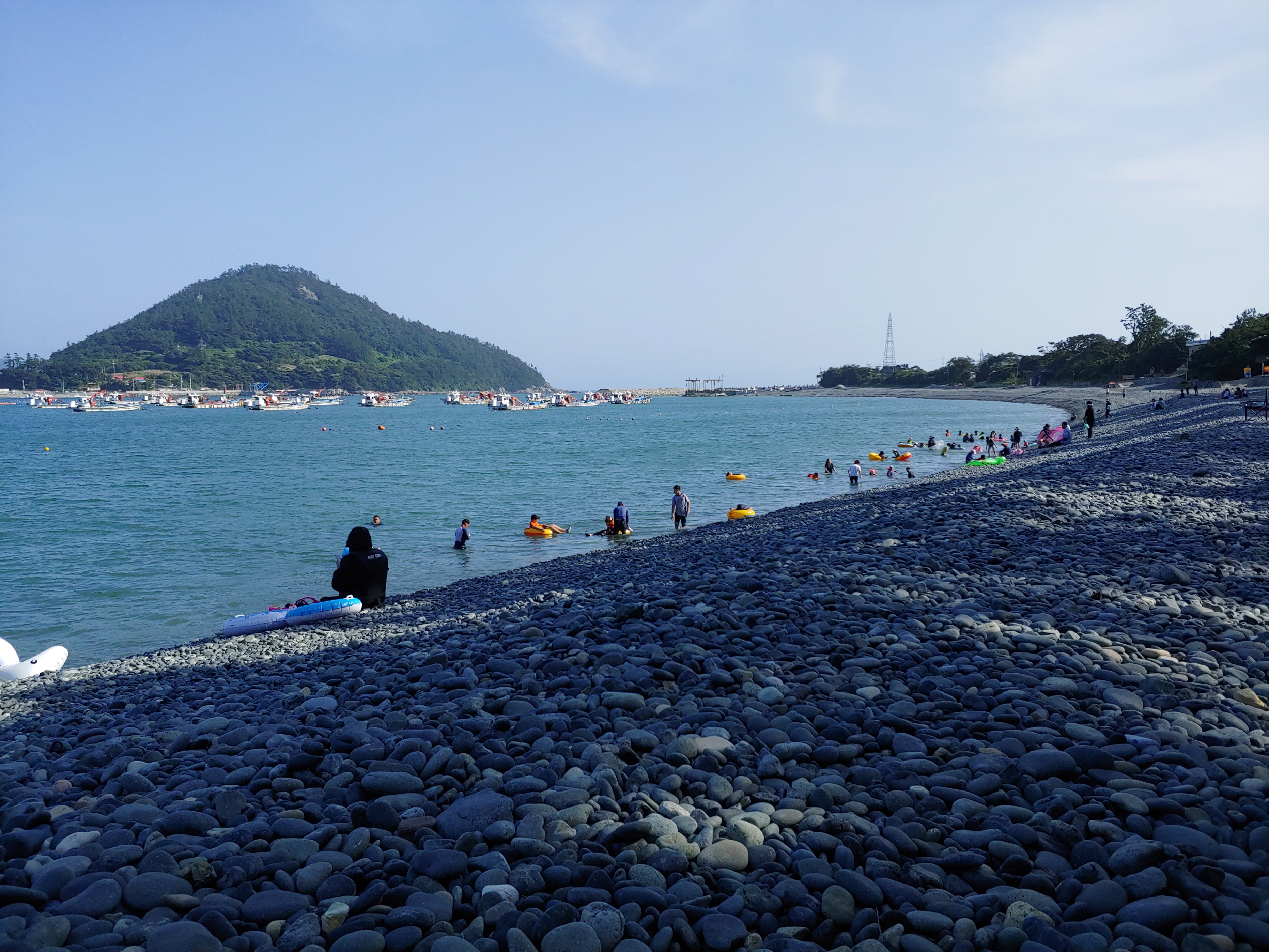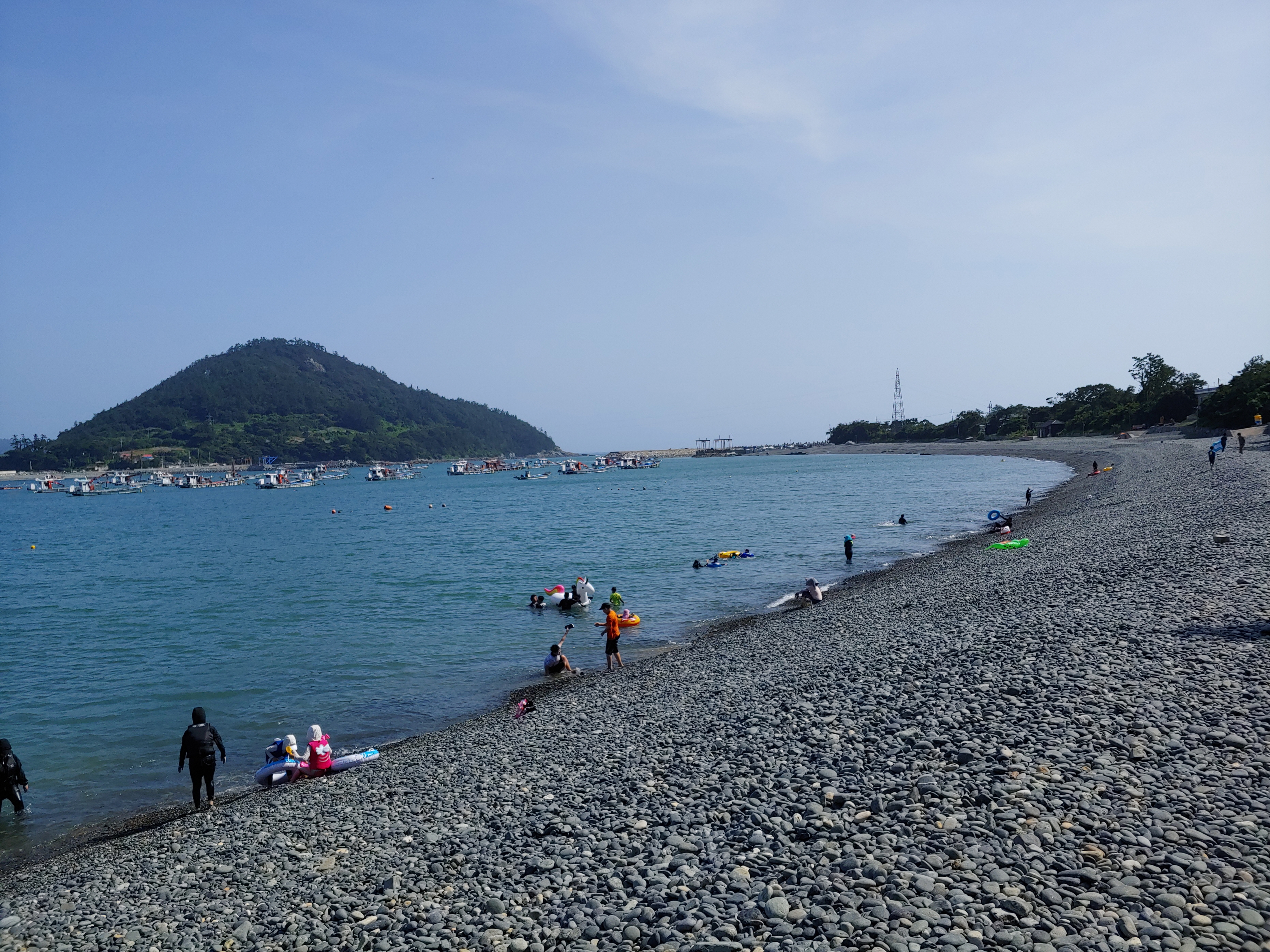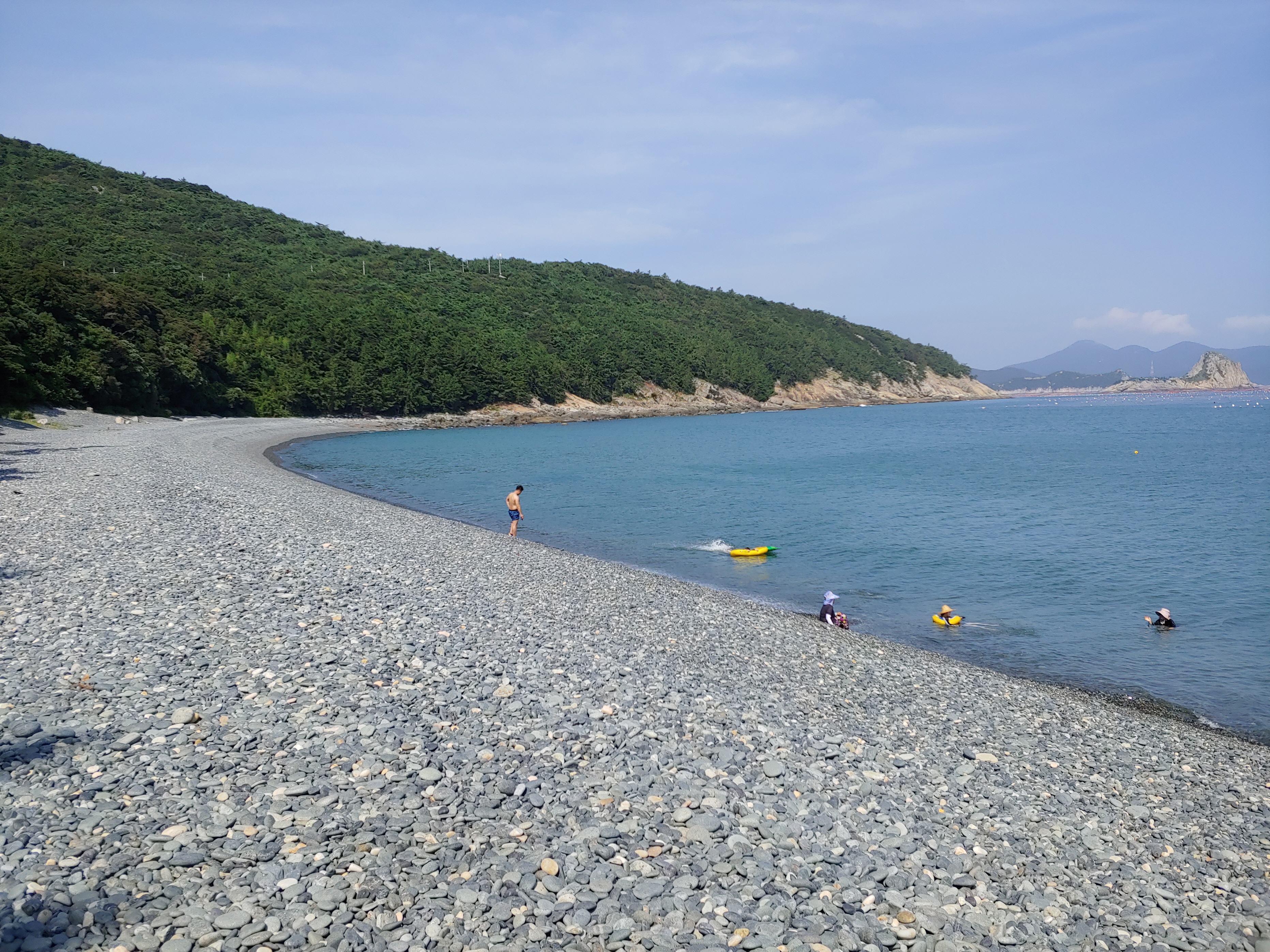 바닥이 갯돌이라 맨발로 다니기엔 통증이 있어 그 부분은 아쉬웠지만 잔 모래들이 따라붙어 찜찜한 것이 없으니까 좋았습니다.