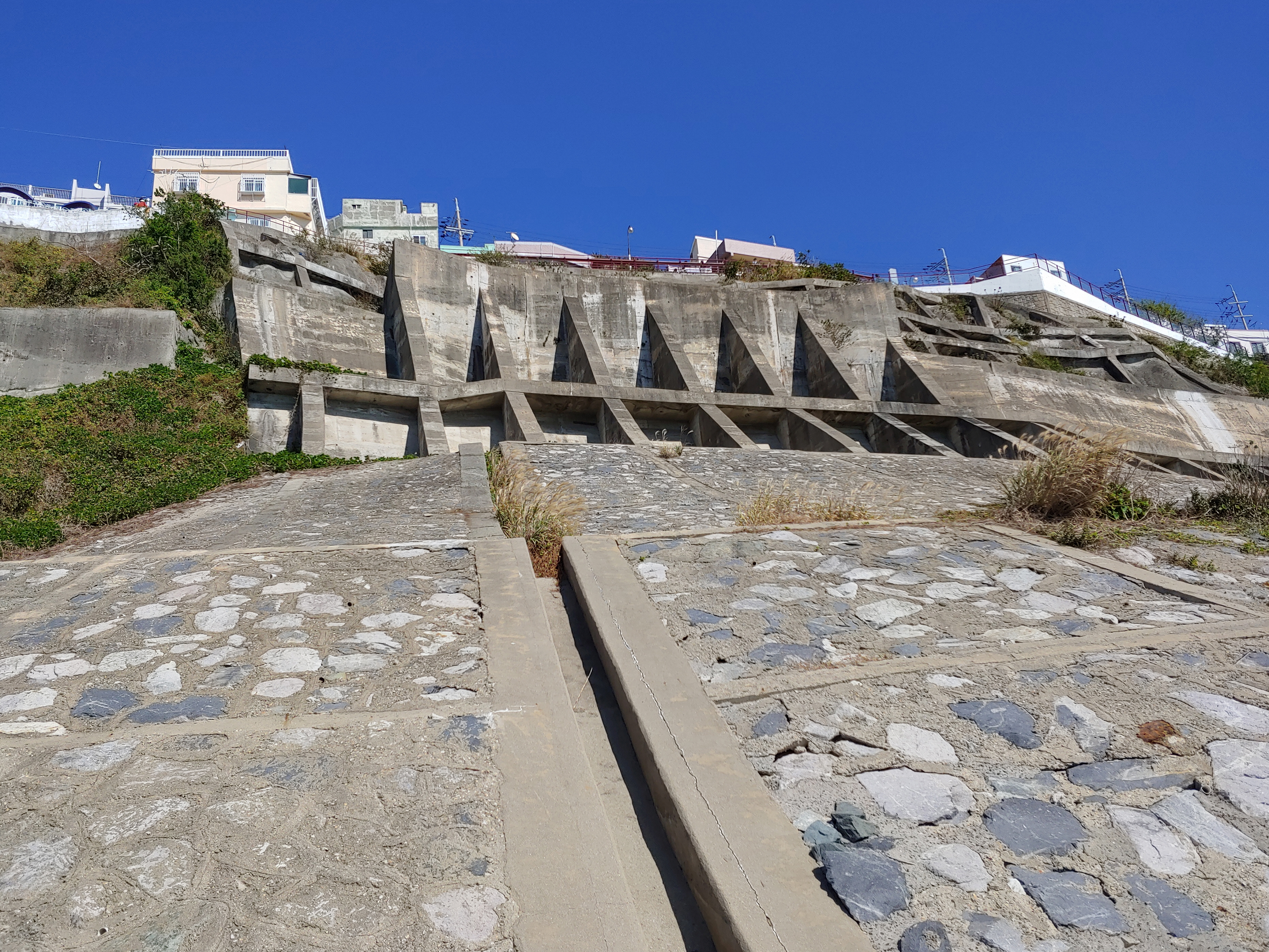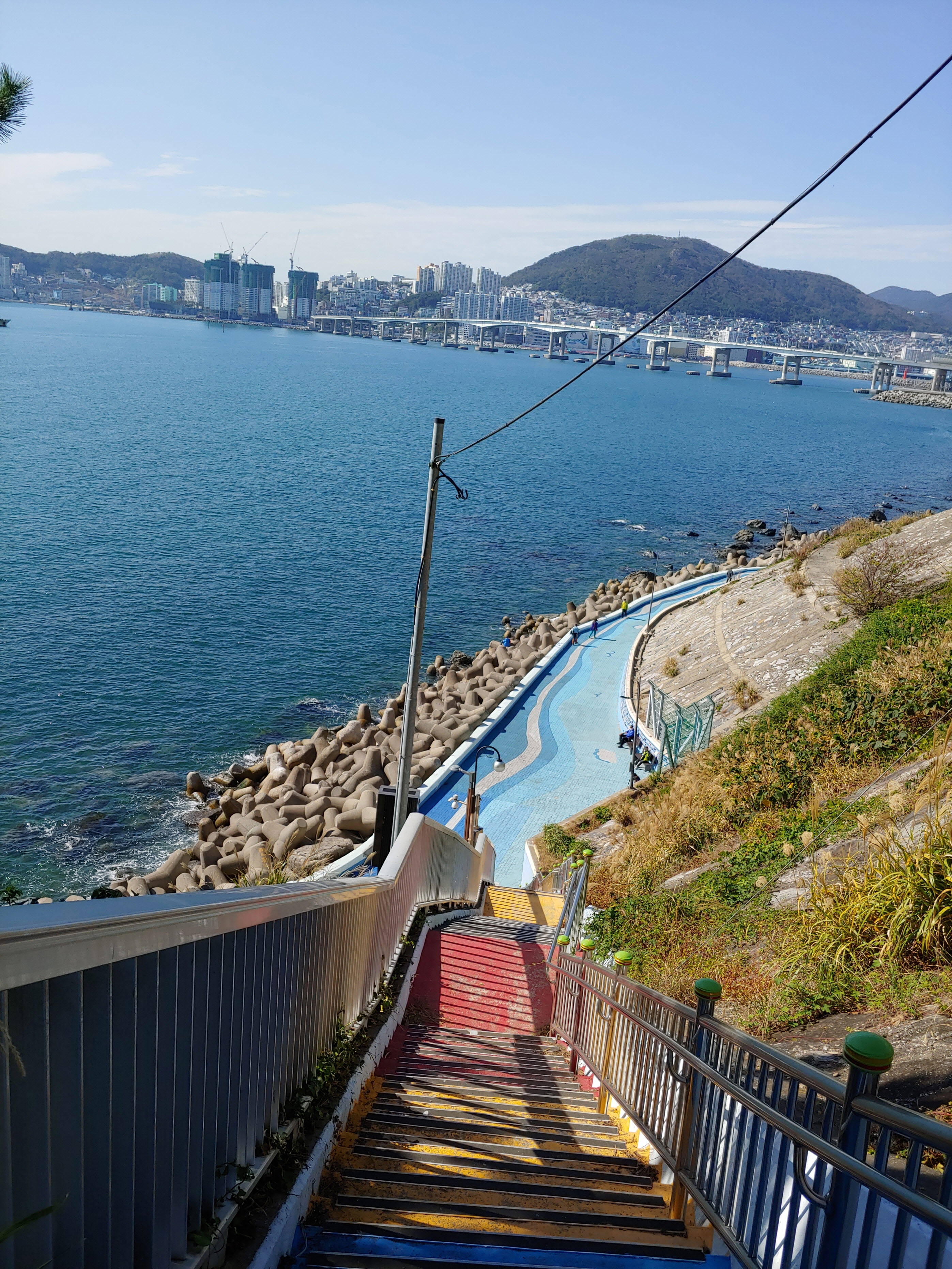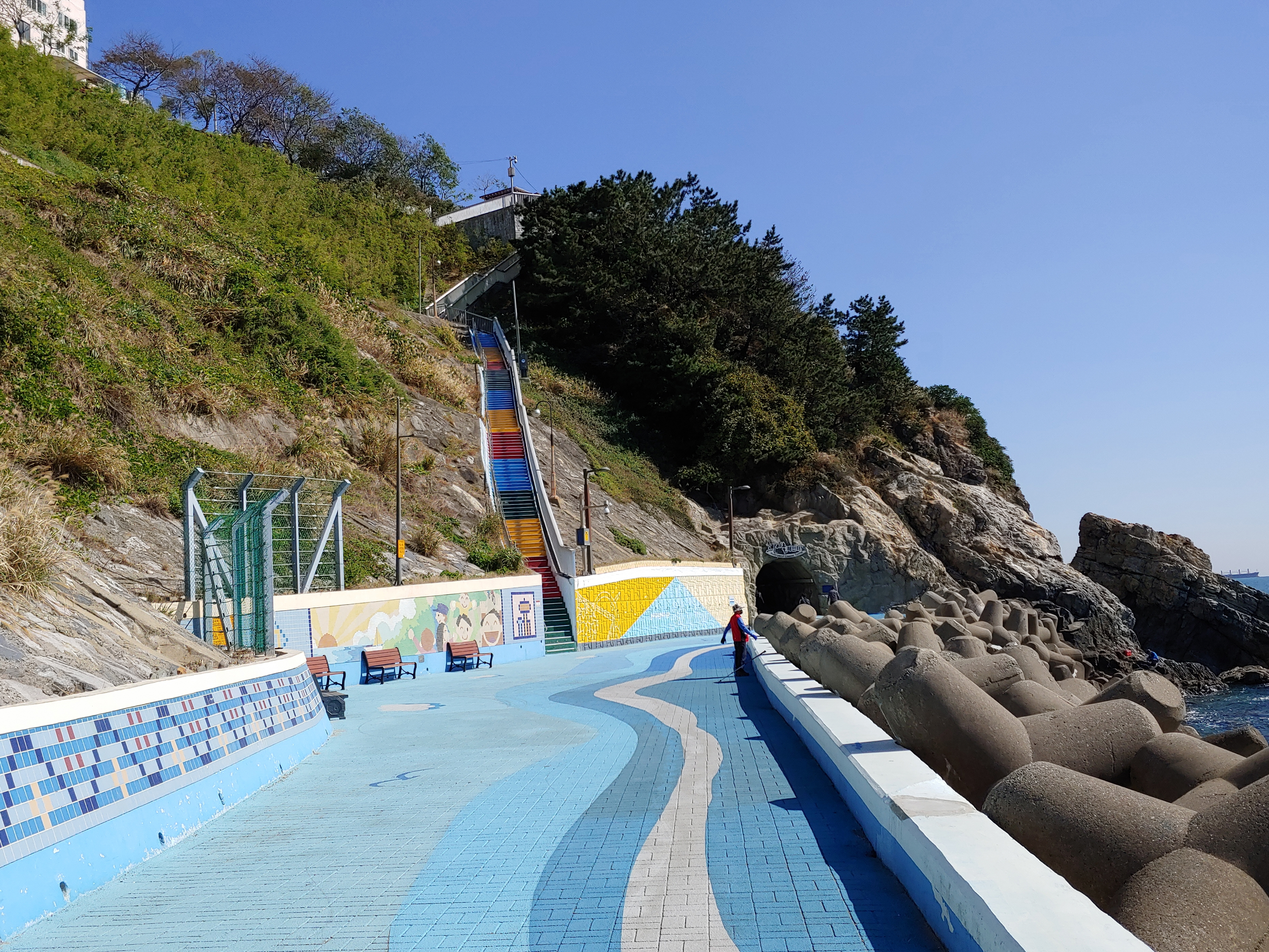 이송도 전망대로 올라가는 계단과 흰여울해안터널이 보입니다.