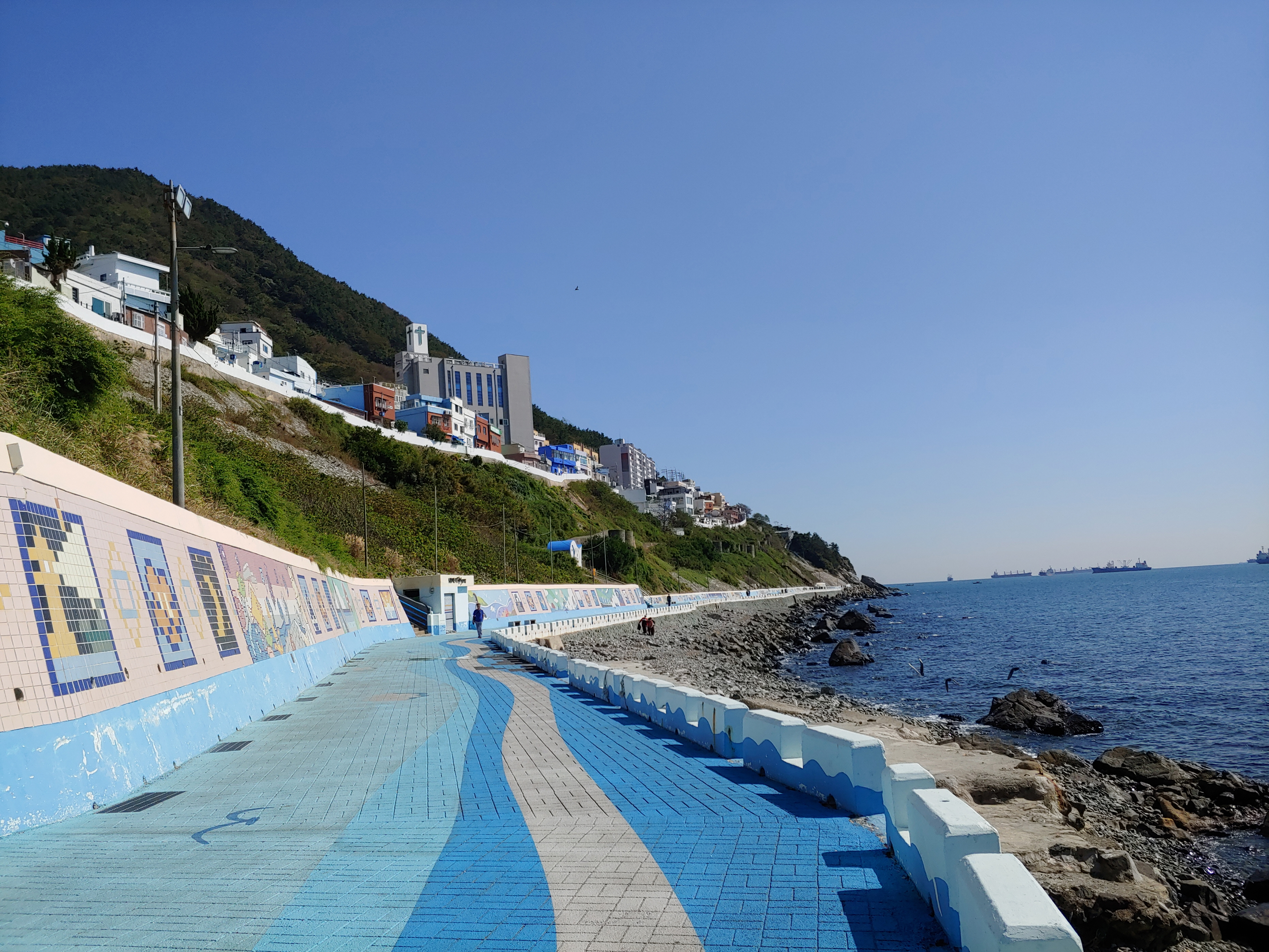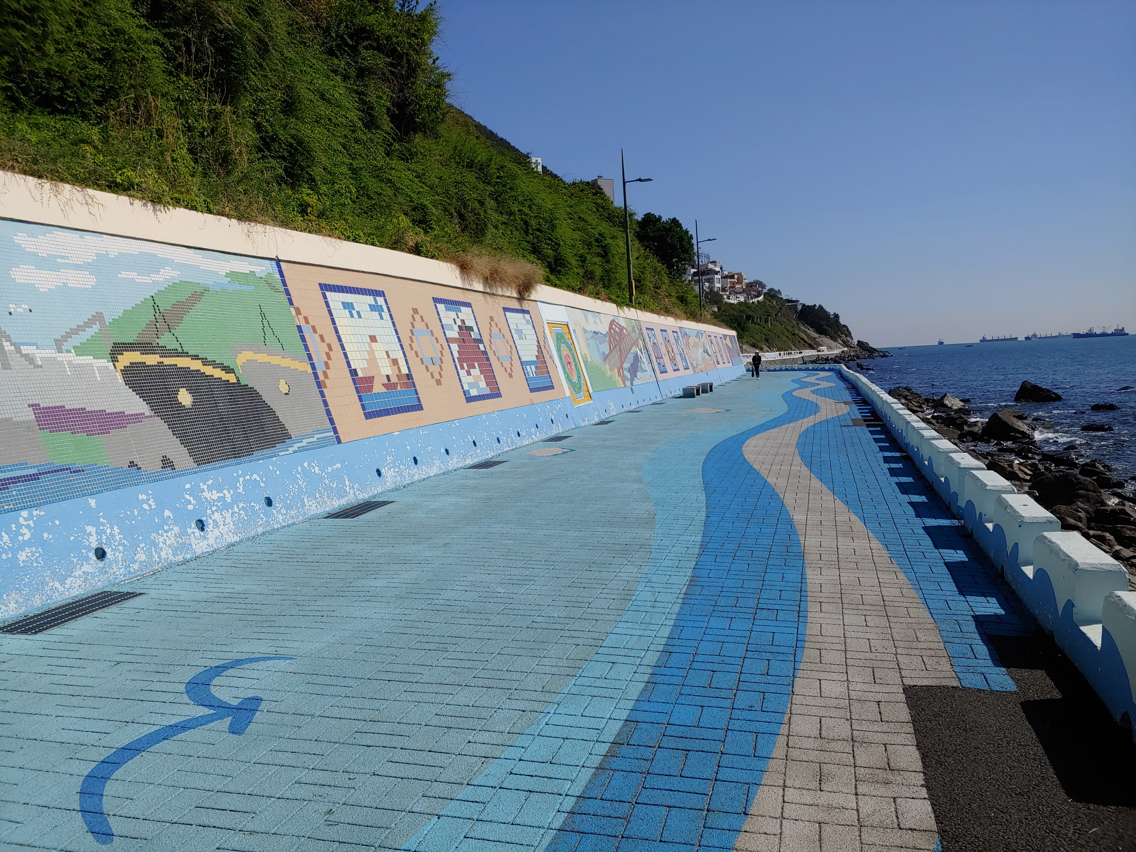 흰여울문화마을 바다산책로에는 바닥에는 파도치는 모습이, 벽에는 다양한 벽화가 그려져 있어서 바다와 매칭이 잘 되는 풍경입니다.