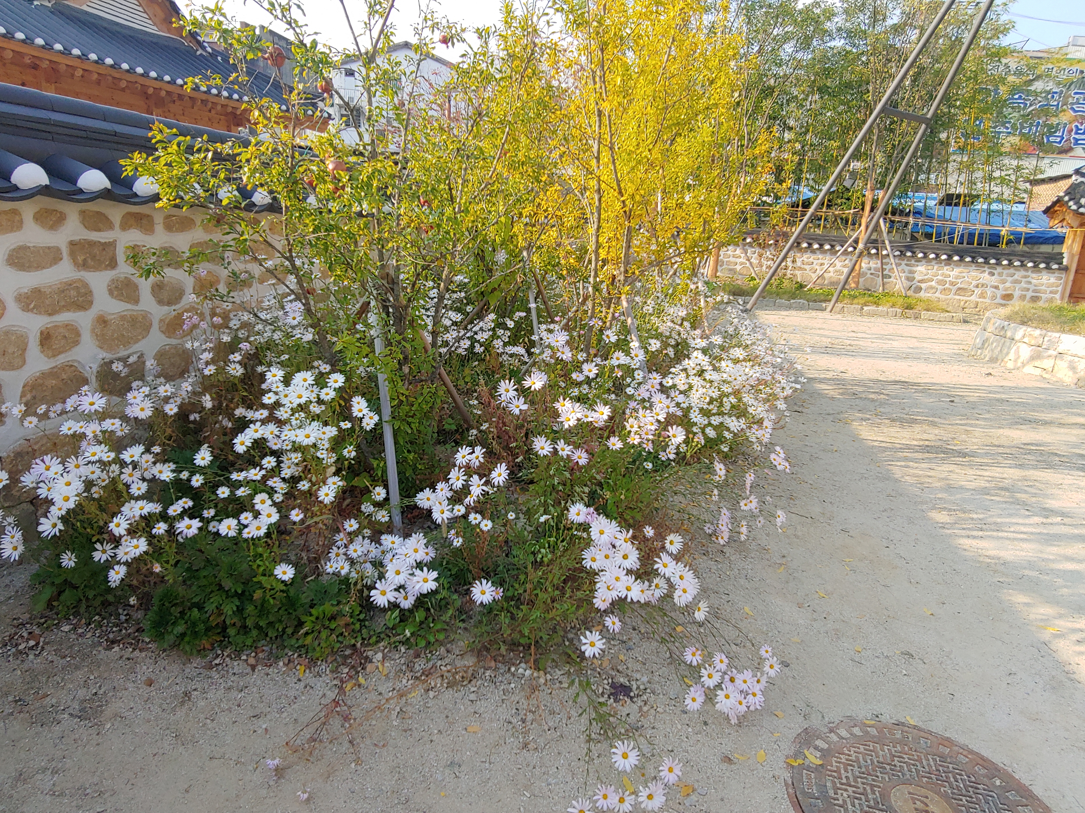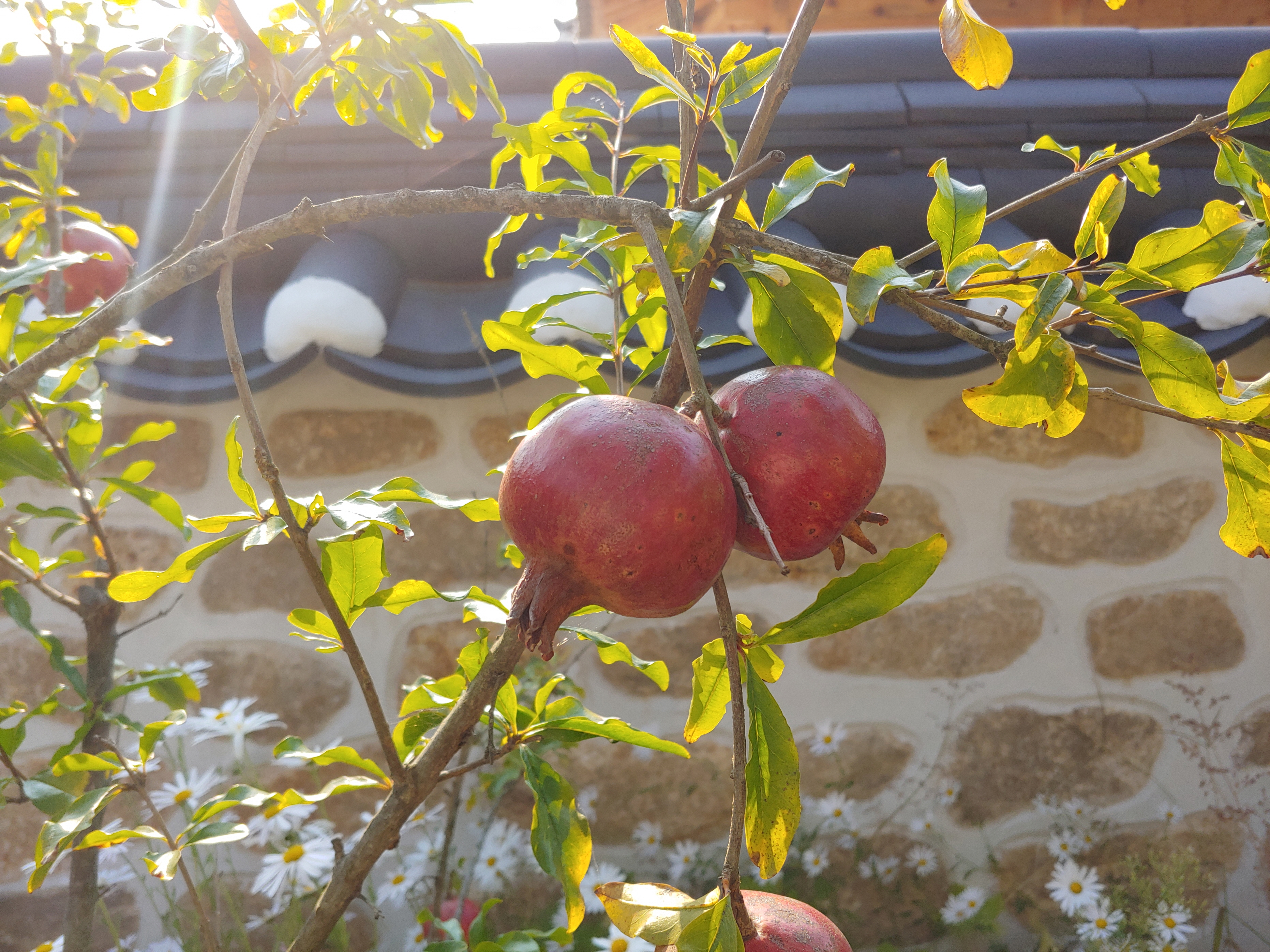 예쁜 국화꽃과 석류 열매가 탐스럽게 익어가고 있습니다.