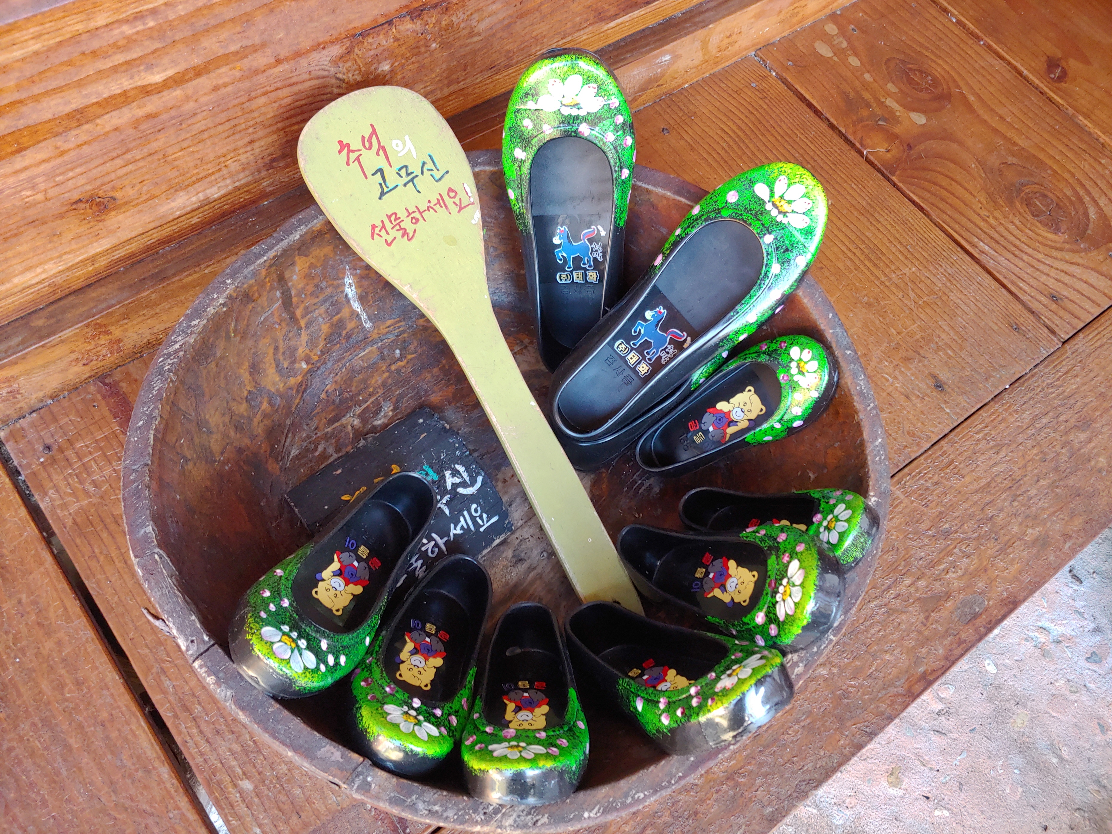 그리고 추억고무신은 사장님이 직접 색을 칠하고 디자인을 하셨다고 하는데 무료로 한 켤레를 주셔서 딸아이가 신고 다녔네요.