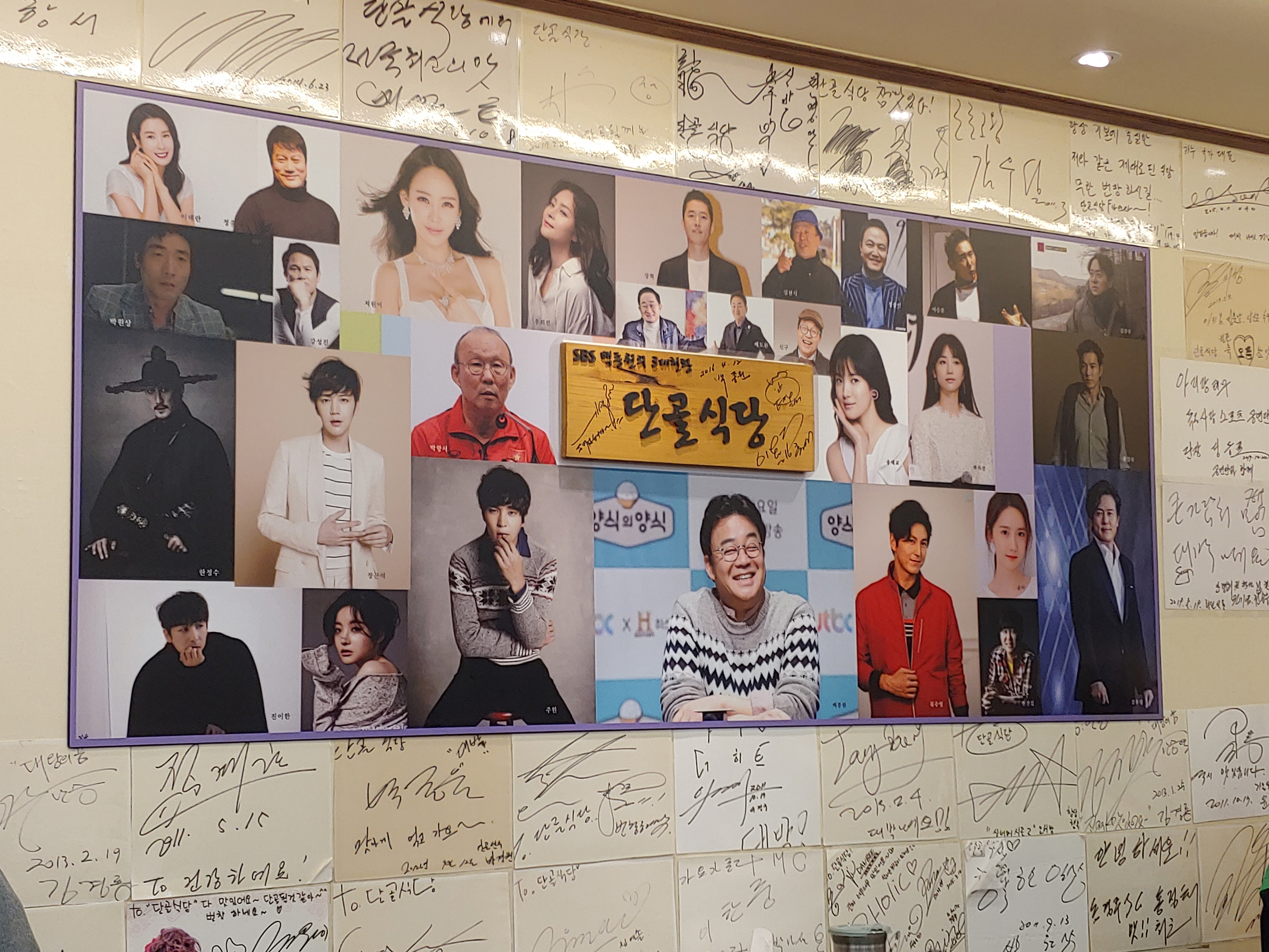 많은 연예인들이 방문하고, 인기인들의 사인이 가득한 벽면 모습입니다.