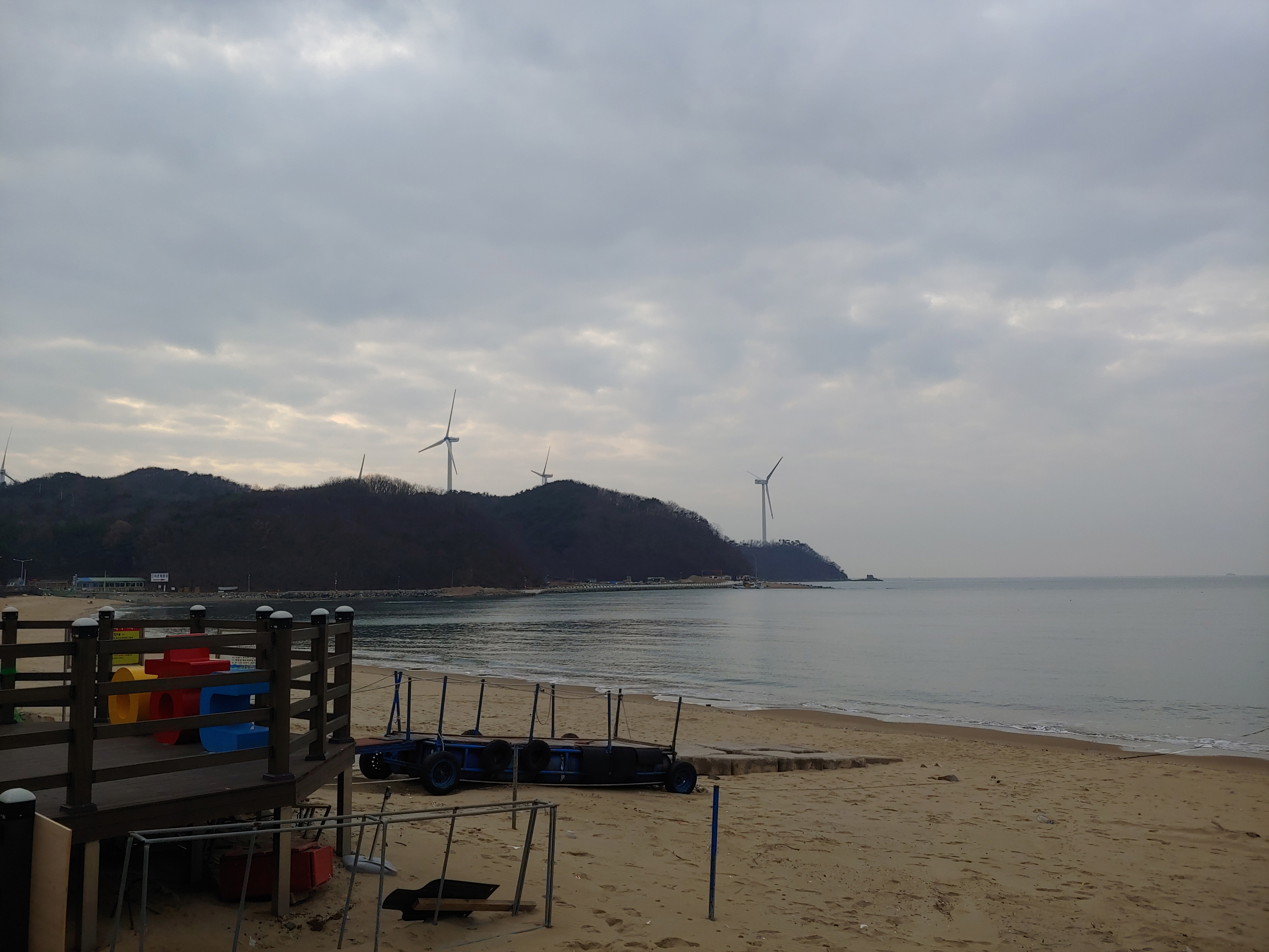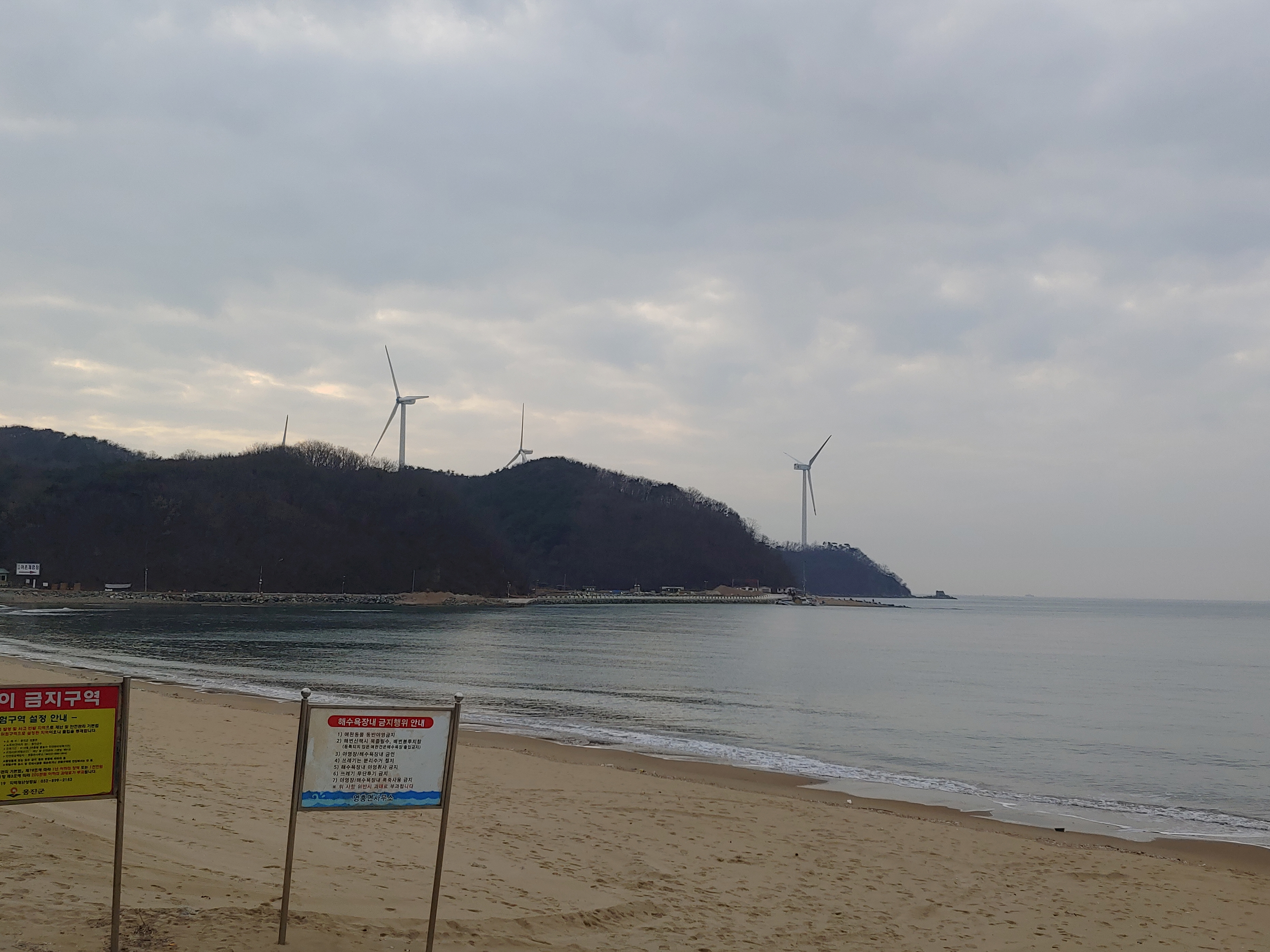 장경리해수욕장 좌측 산 너머에 국내 순수기술로 풍력발전 설비가 2011년에 조성된 것이라고 하네요.