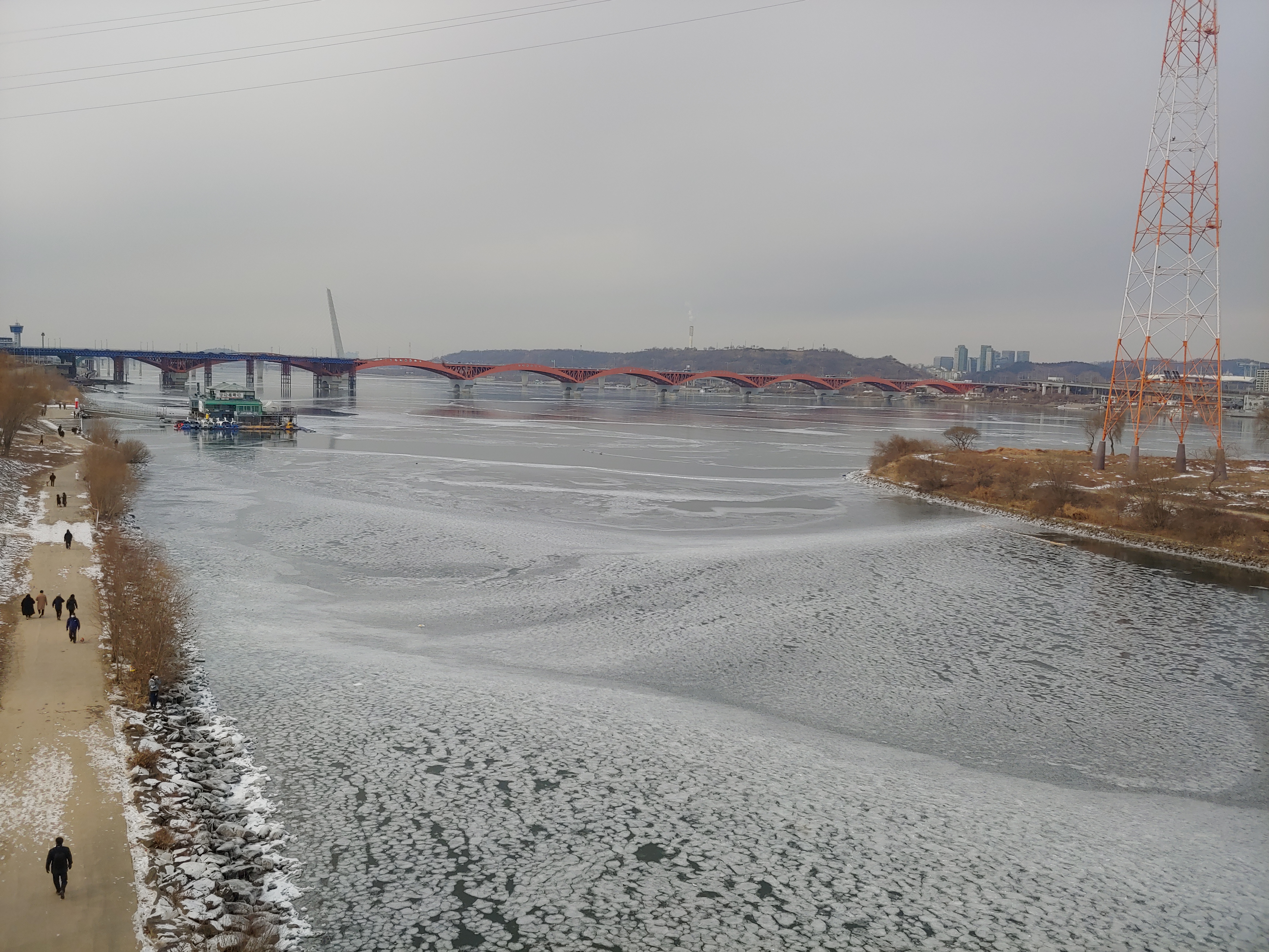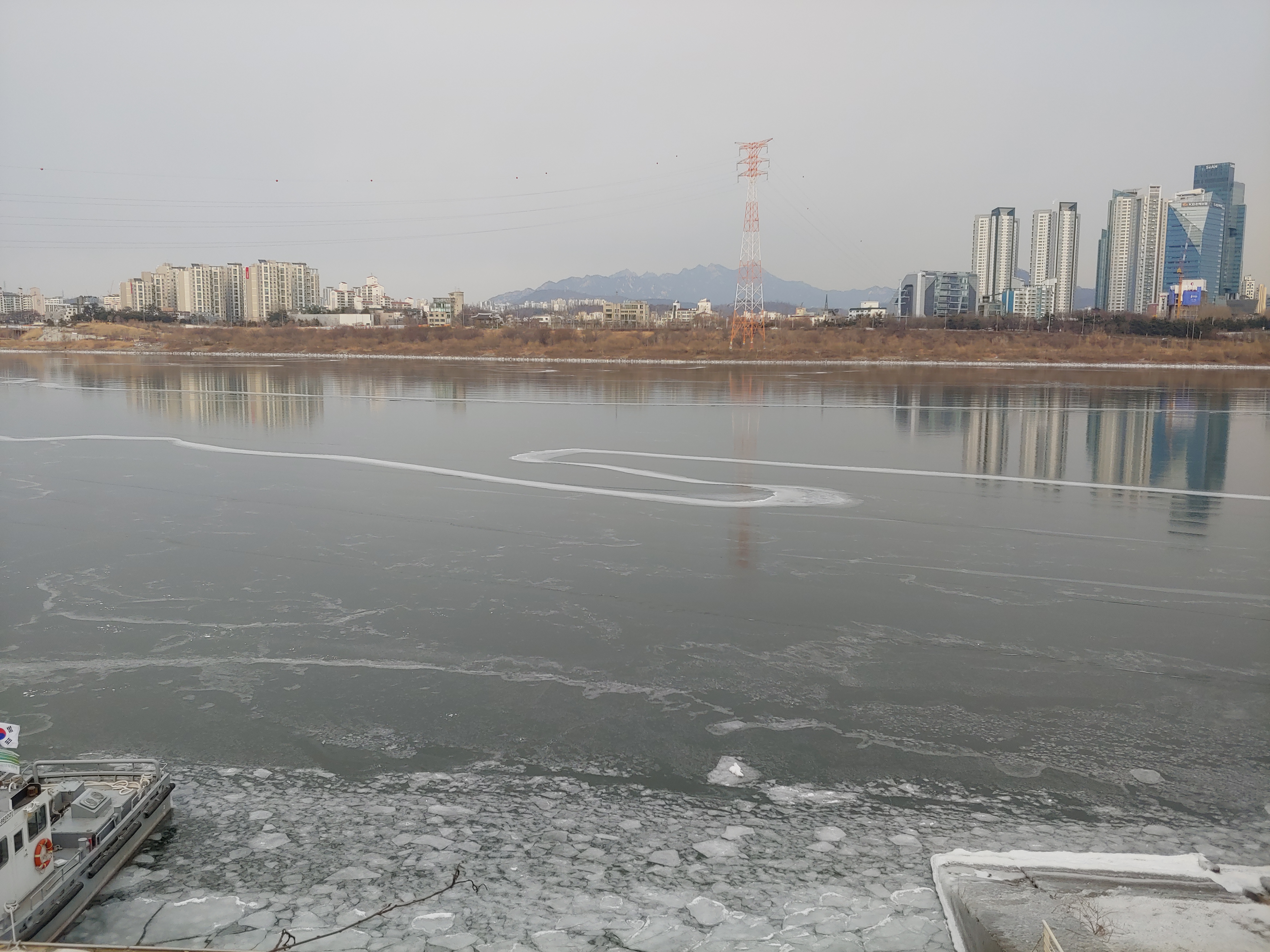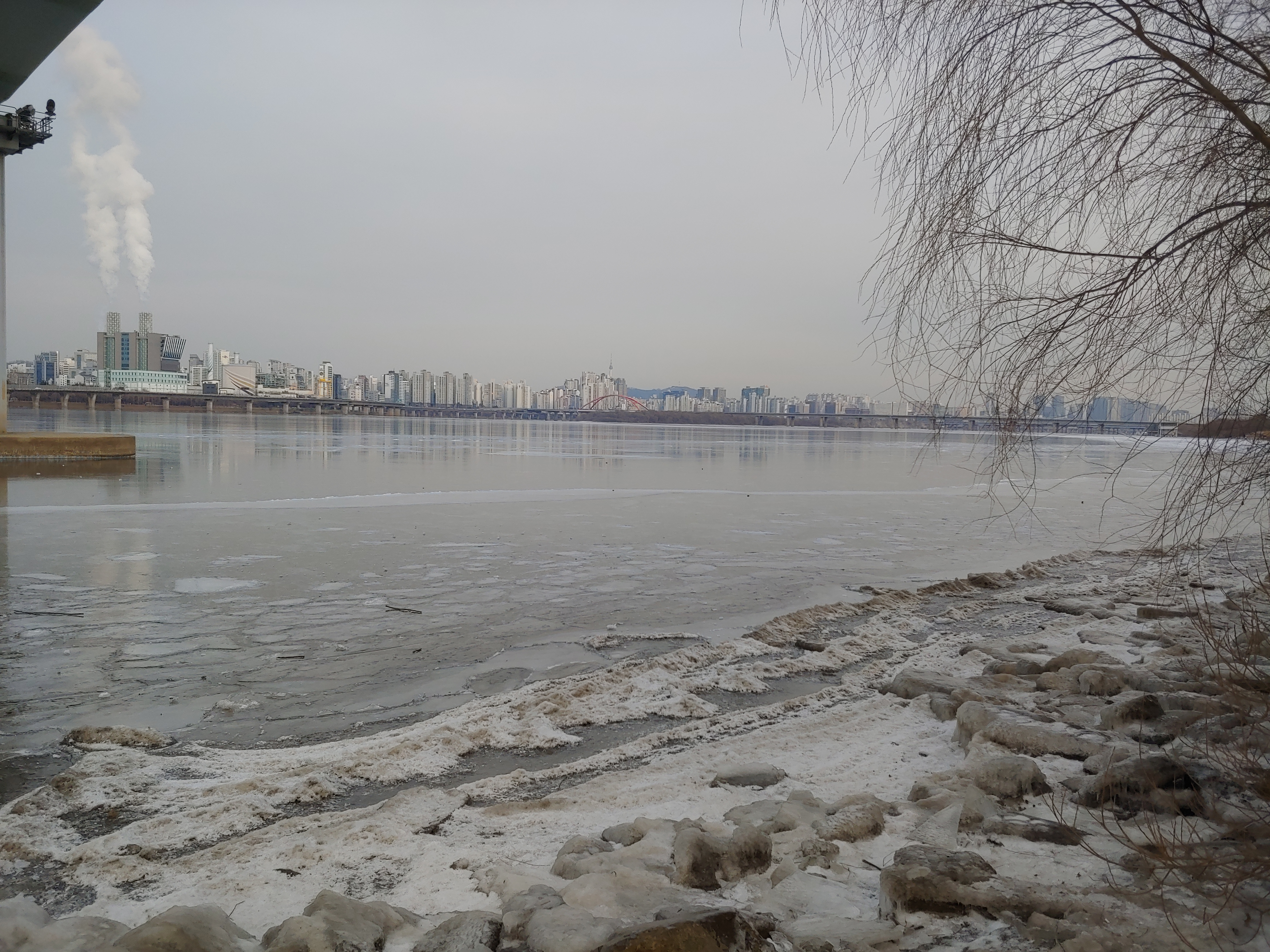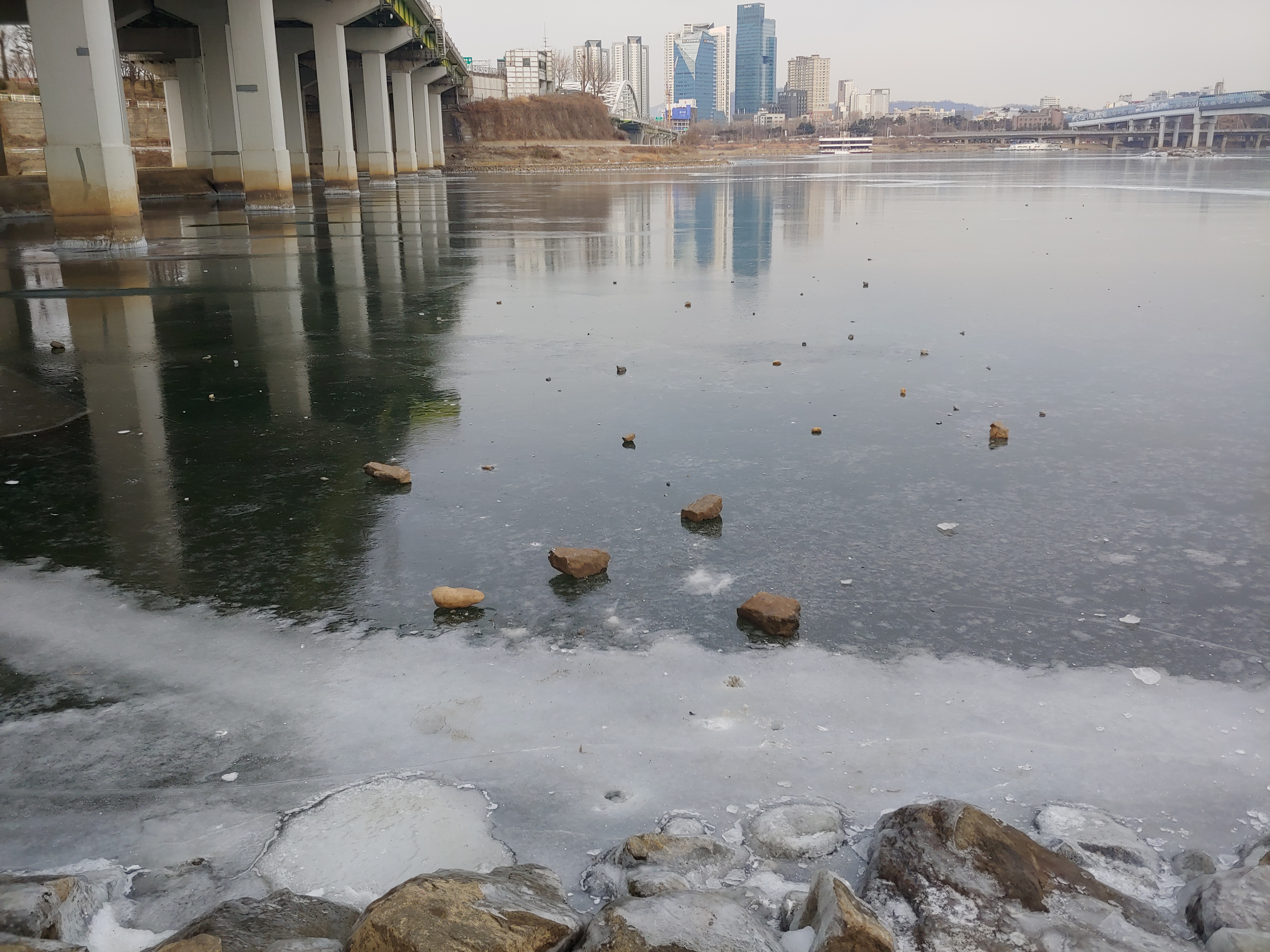 일주일 넘게 강추위가 계속되면서 한강 전체가 꽁꽁 얼어붙은 모습을 봤는데, 서울생활 10년이 넘은 기간에 처음이었네요.