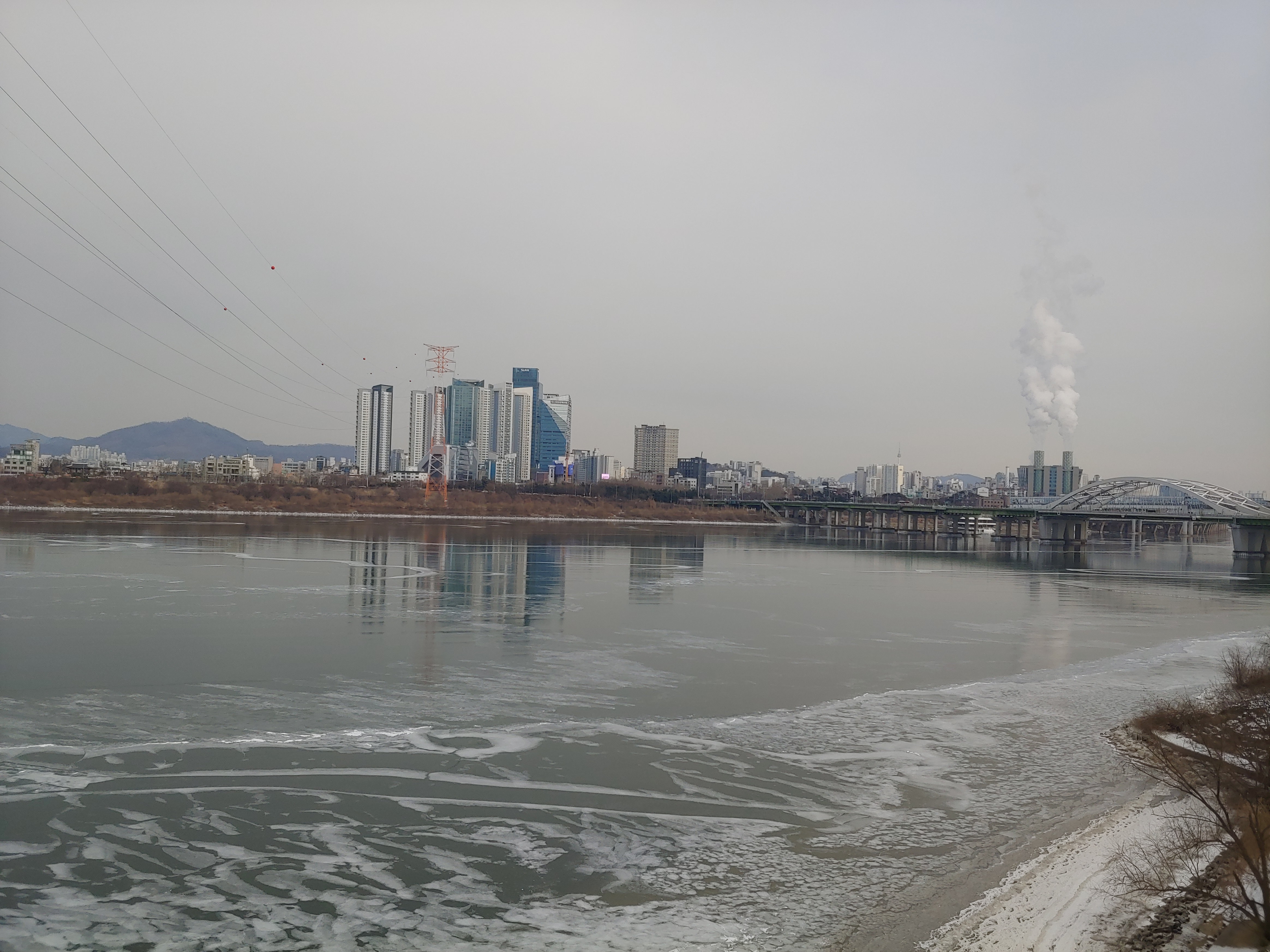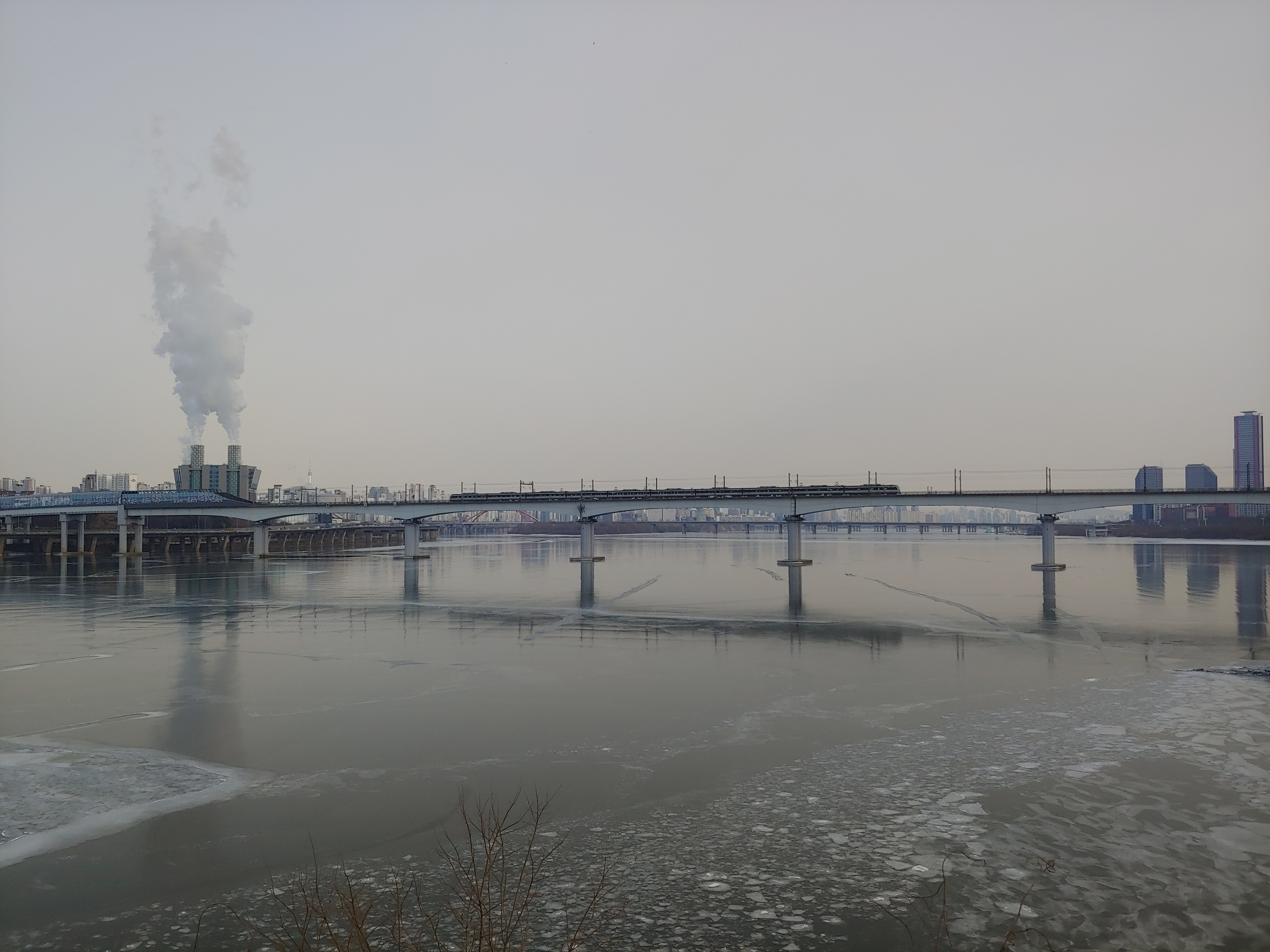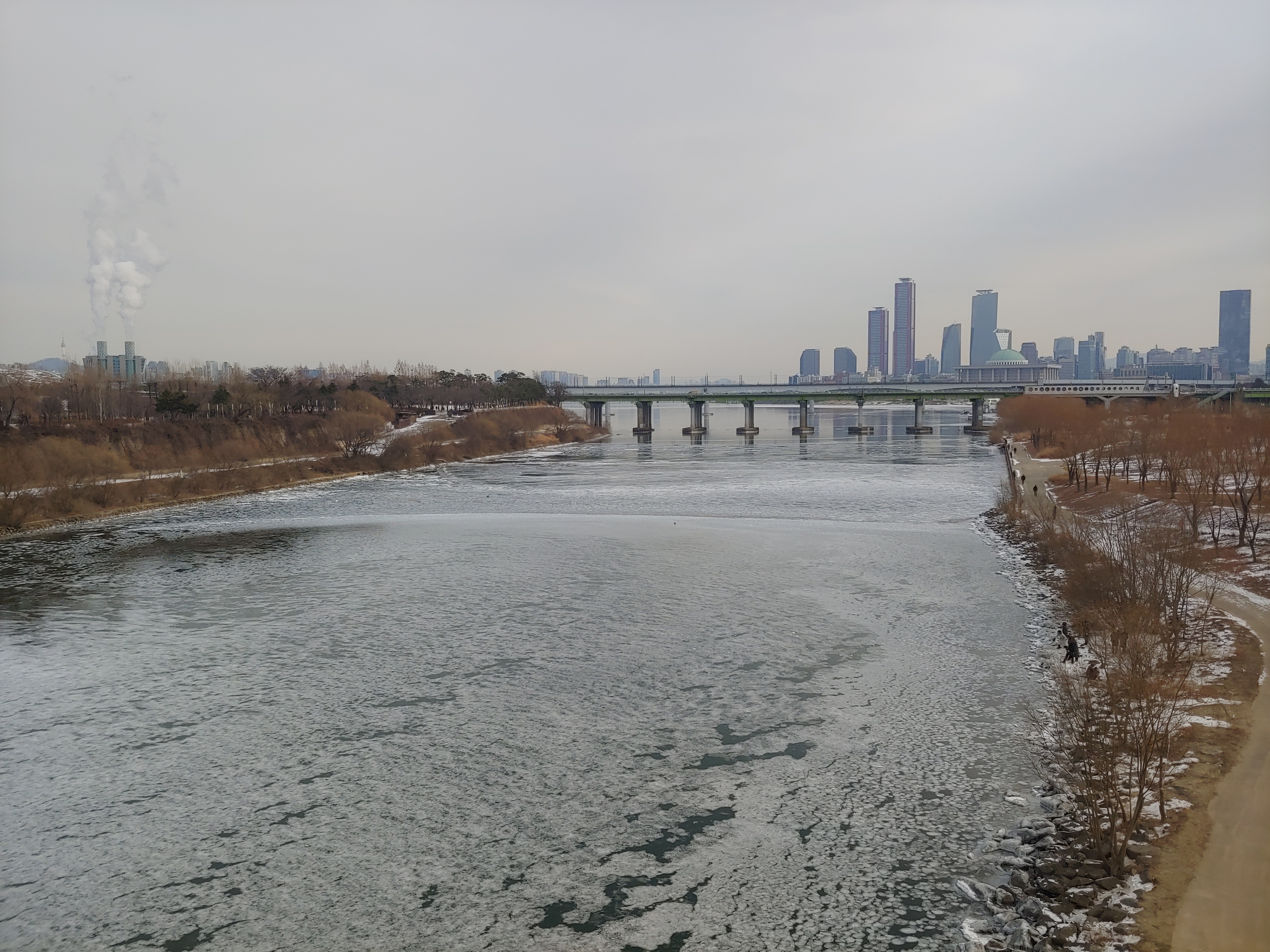 일주일 넘게 강추위가 계속되면서 한강 전체가 꽁꽁 얼어붙은 모습을 봤는데, 서울생활 10년이 넘은 기간에 처음이었네요.