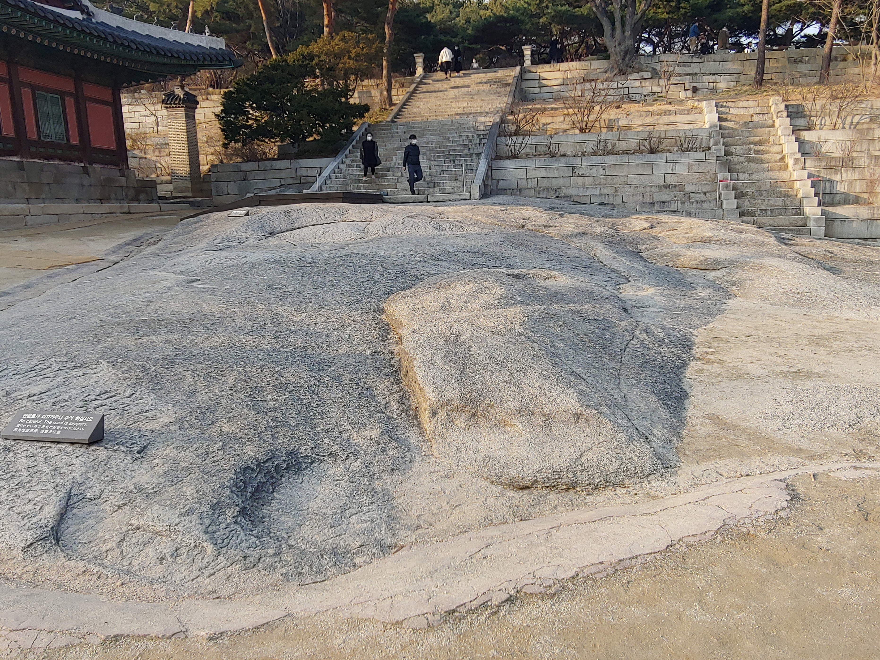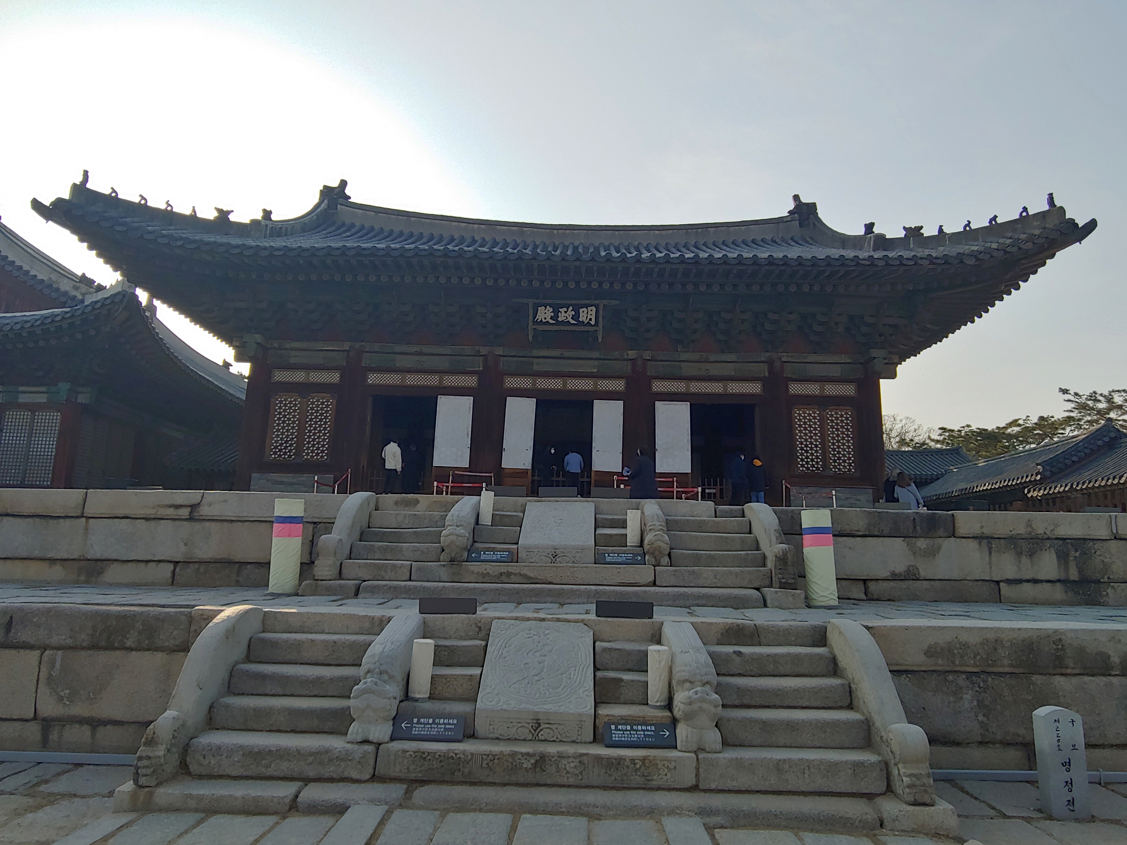명정전으로 오르는 계단 가운데 있는 경사진 돌을 답도라 하는데 그 위로 국왕이 탄 가마가 지나갔다고 합니다.