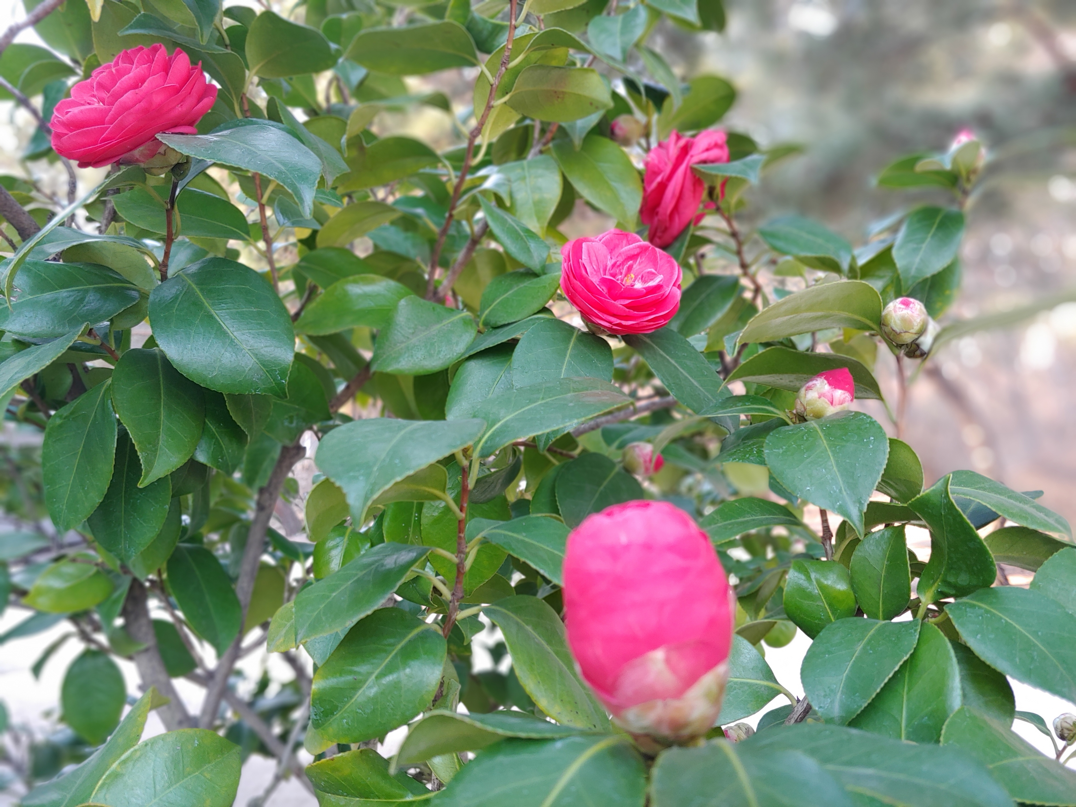 대온실 앞에 있는 동백나무에 꽃이 활짝 피었습니다.