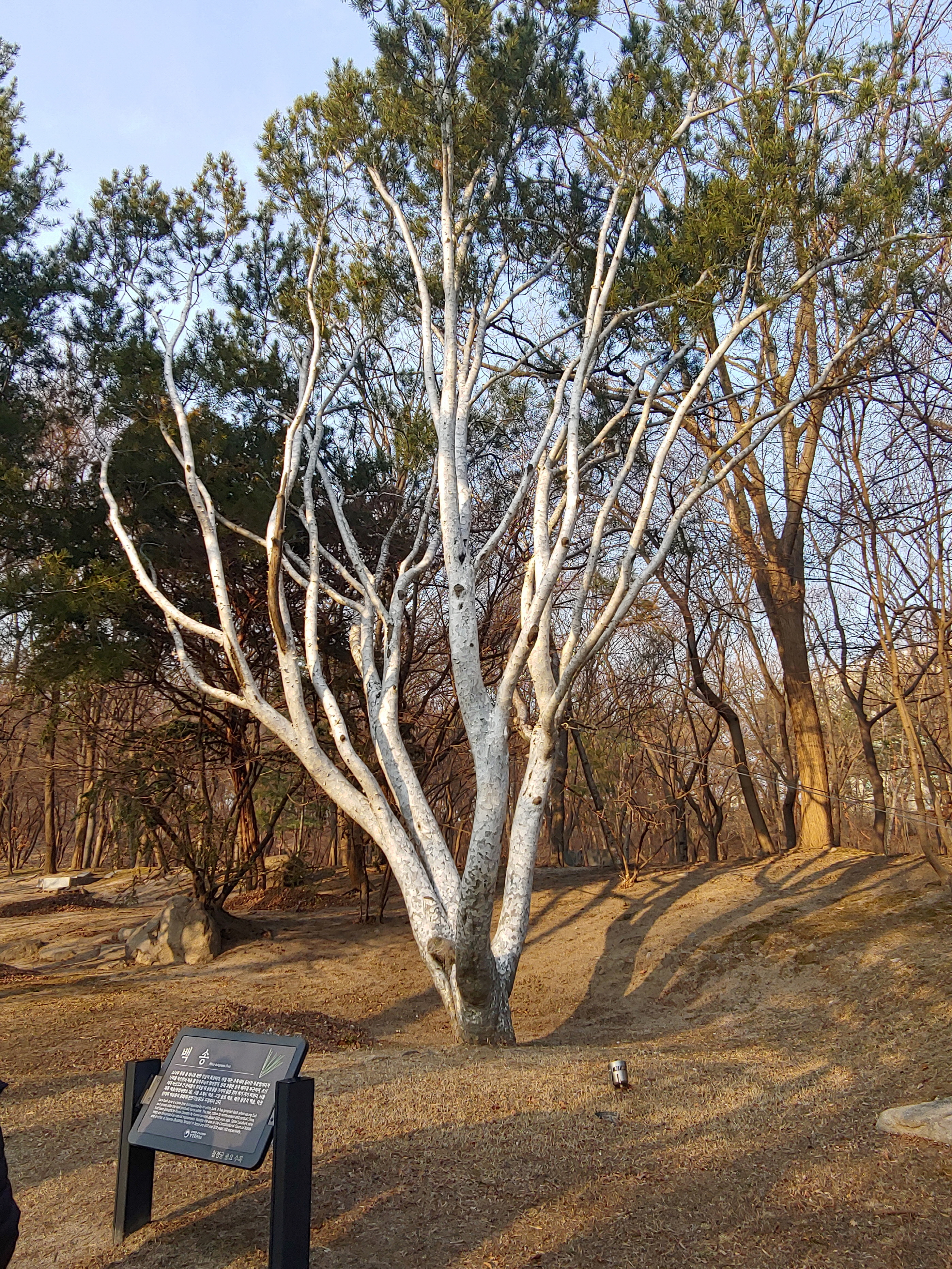 어릴 때엔 초록색이 들어간 푸른빛이다가 나이를 먹으면서 차츰 흰 얼룩무늬가 많아지는 소나무라고 합니다.