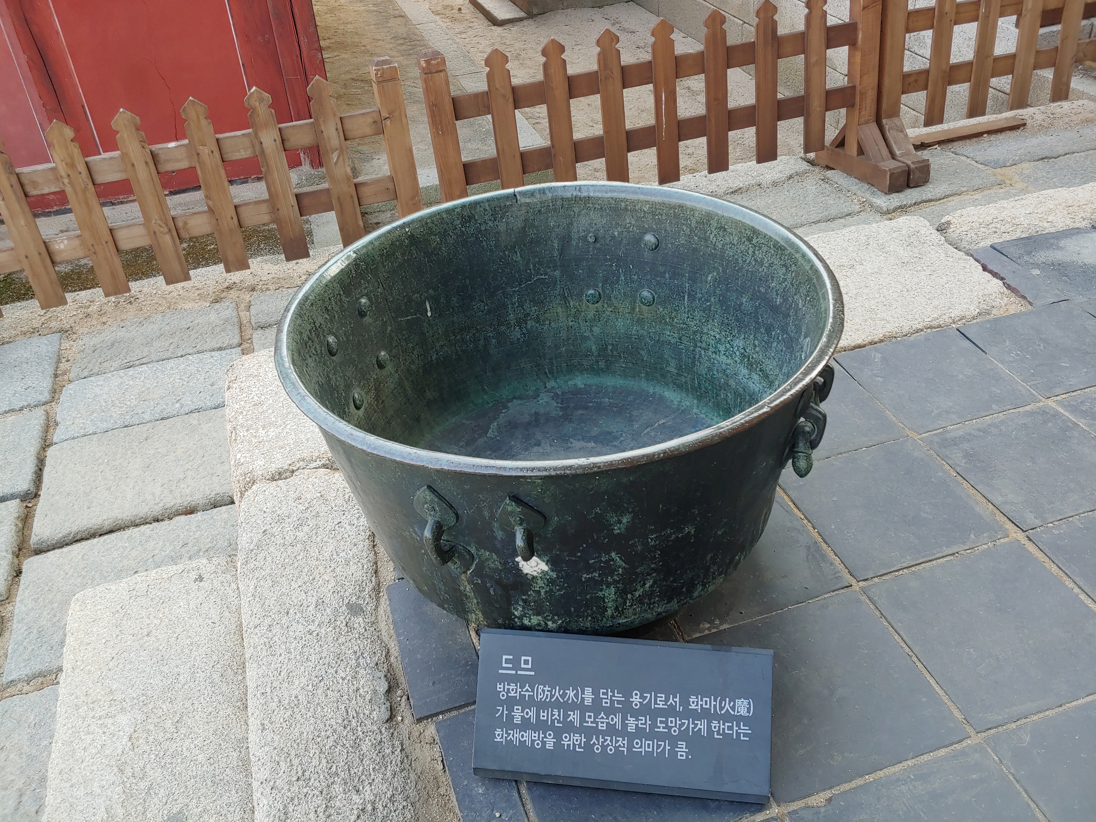 드므에는 물을 가득 담아두어 화재예방의 의미가 있지만, 화마가 불을 지르러 왔다가 물에 비친 자기 모습을 보고 놀라서 달아났다는 이야기도 있습니다.