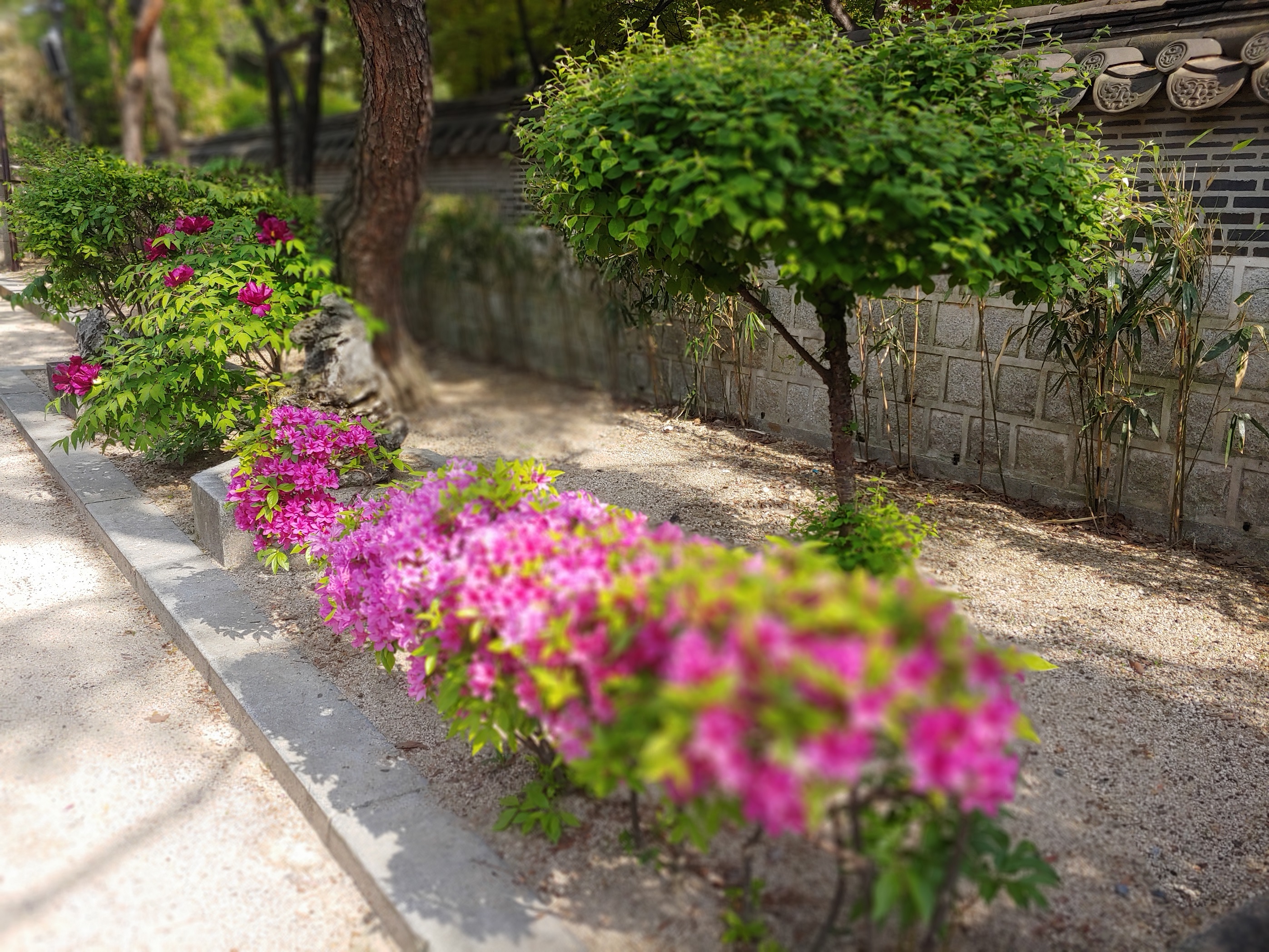 노안당 정원에는 철쭉과 작약으로 보이는 꽃이 활짝 피어 있습니다.