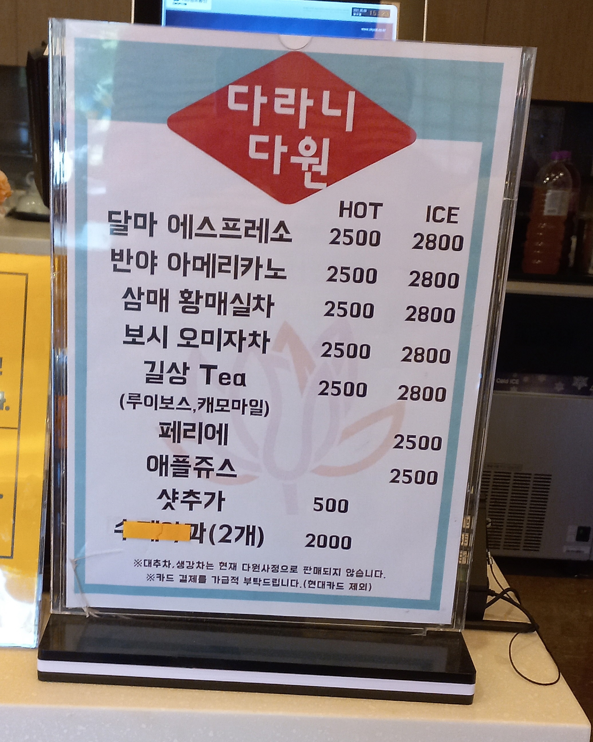 오미자차와 커피와 사과주스를 주문해서 마시고 나왔습니다.