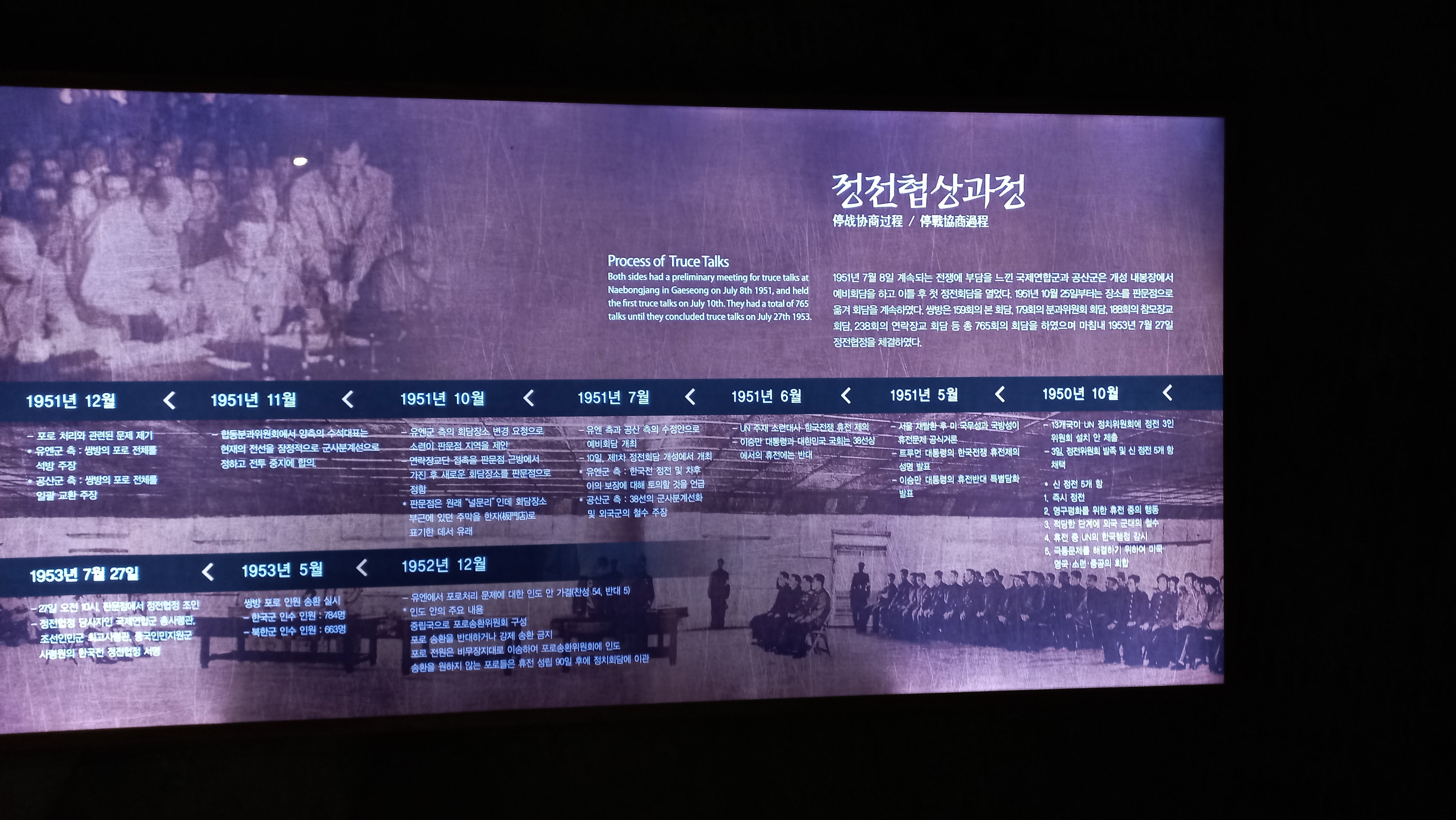 국제연합군과 공산군은 1951년 7월 8일부터 최종 정전협정이 있던 1953년 7월 27일까지 159회의 본 회담, 179회의 분과위원회 회담, 188회의 참모장교 회담, 238회의 연락장교 회담 등 총 765회의 회담을 했다고 합니다.
