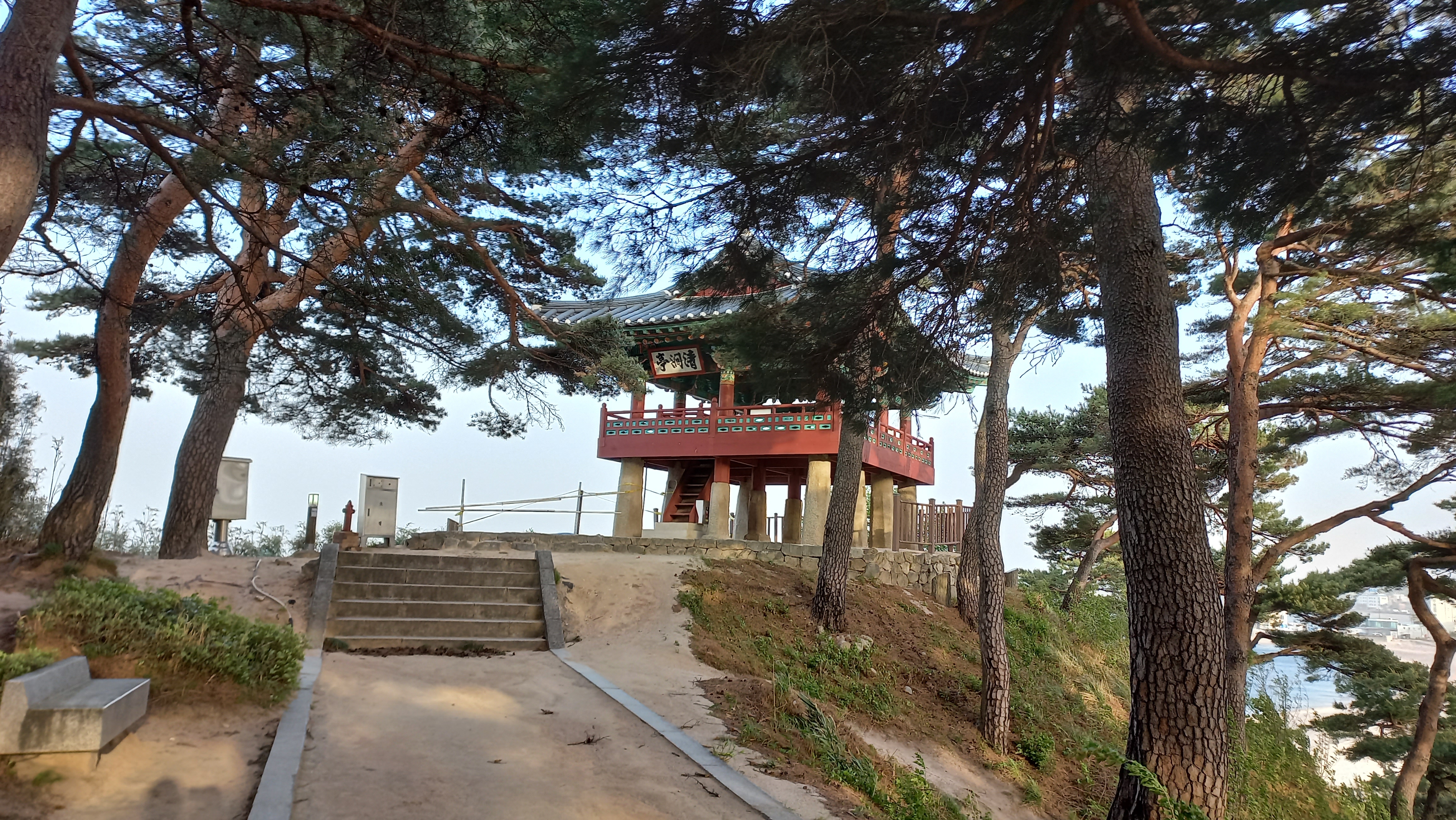 백 걸음 정도 짧은 산길을 오르면 깎아지른 듯한 벼랑 끝에 선 청간정이 나타납니다.