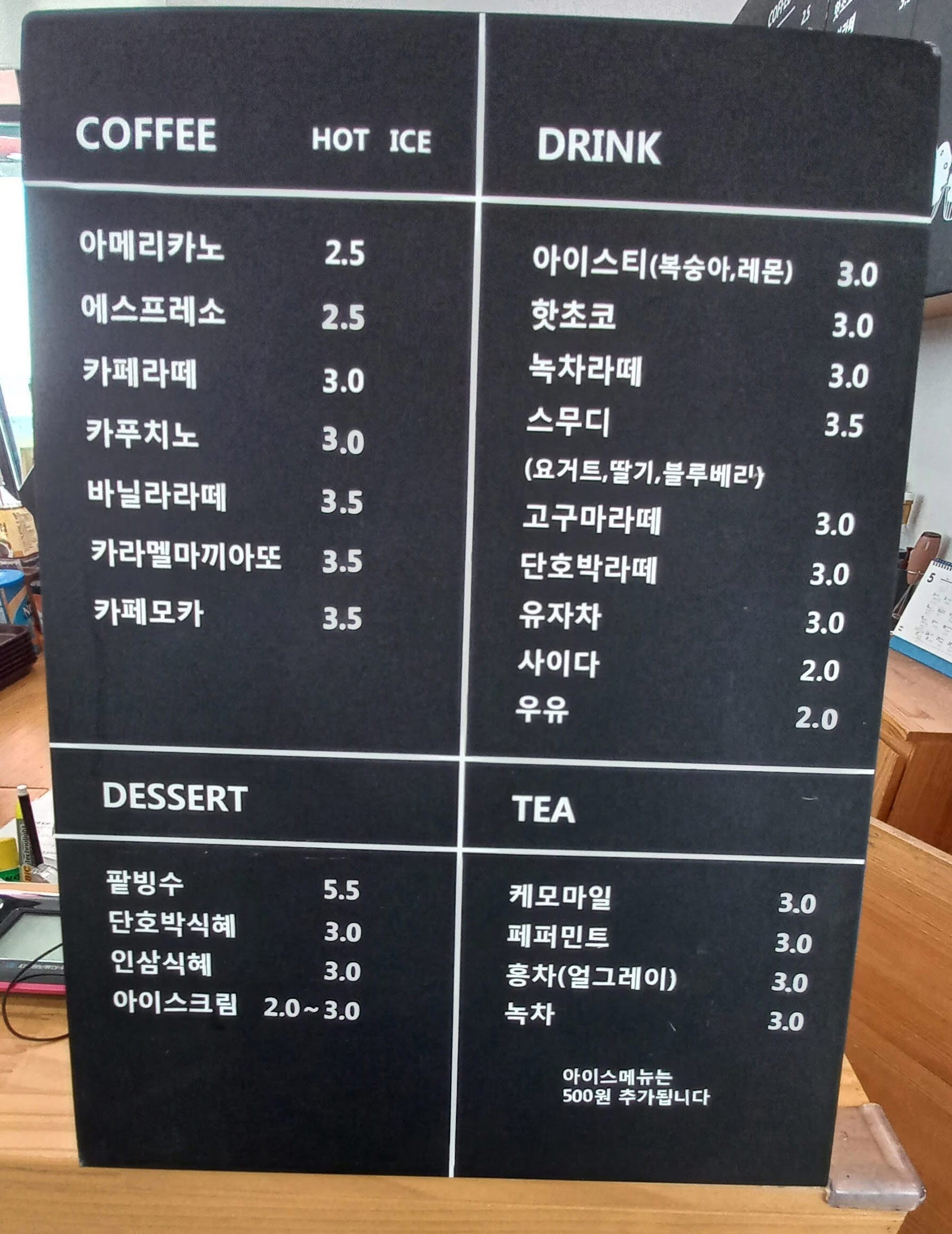 아메리카노가 2,500원(이이스 추가 500원) 등으로 가격이 착하네요.