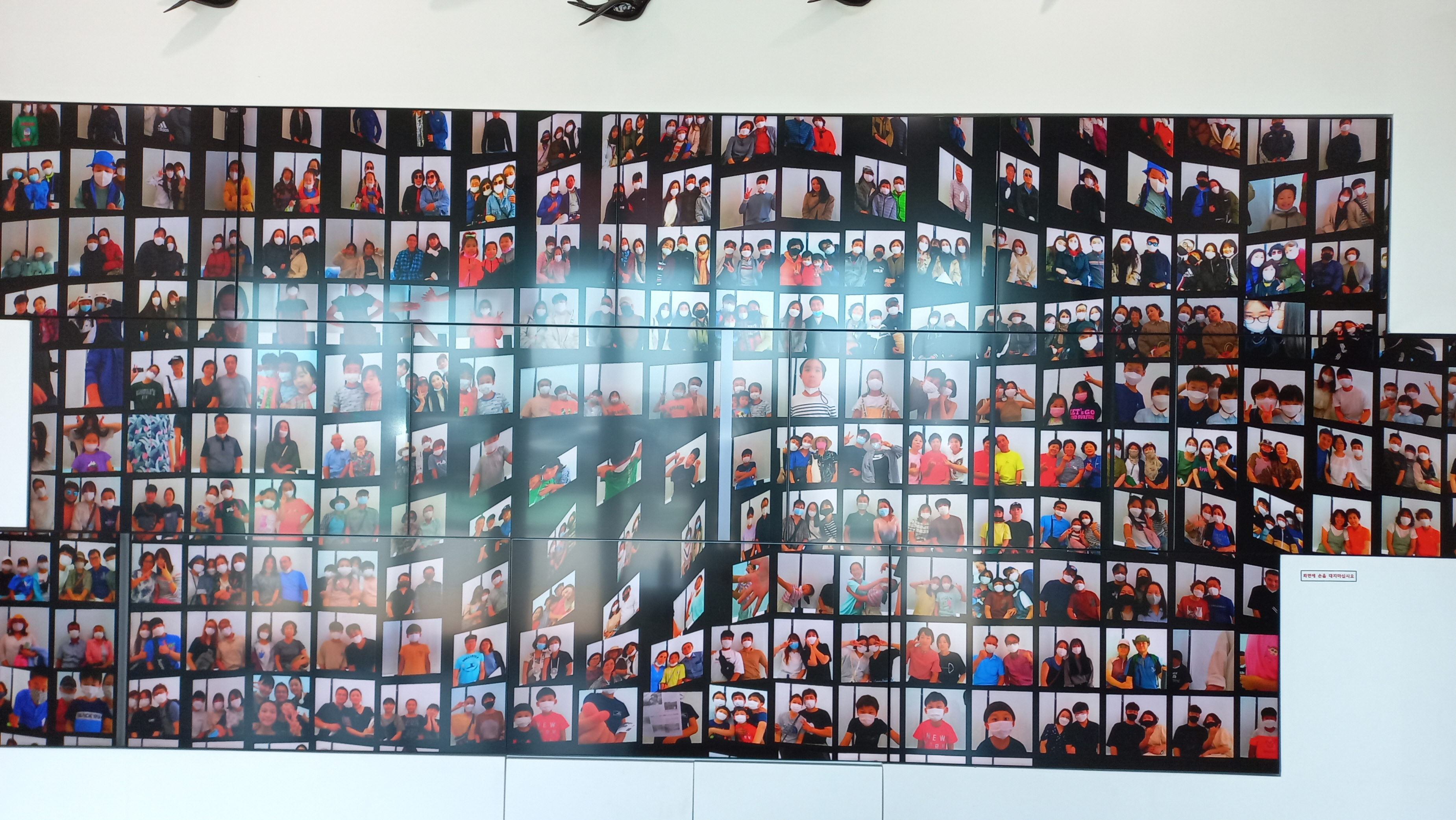 평화를 기원하는 다양한 사람들의 사진들이 디스플레이에 펼쳐집니다.
