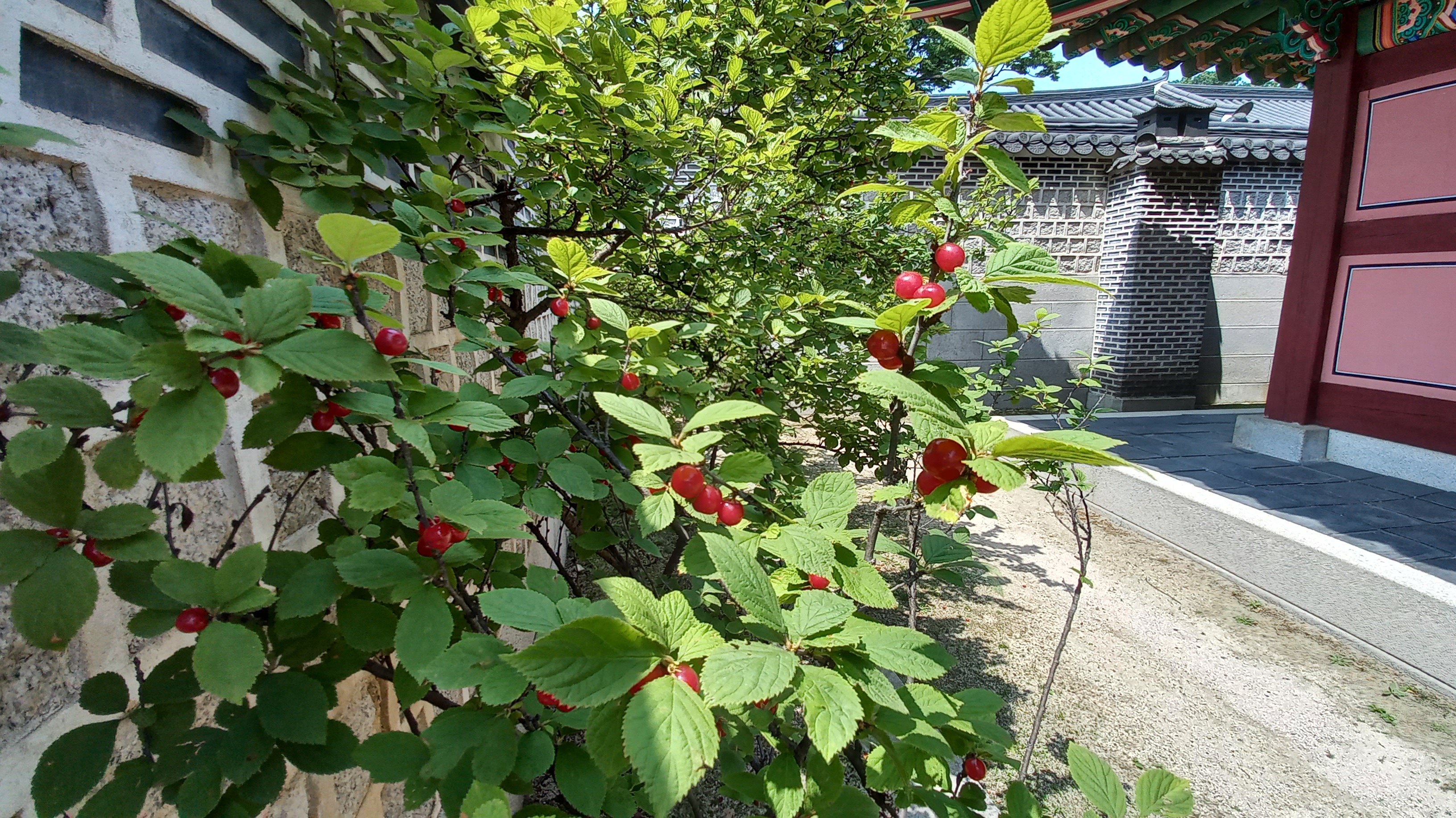 옥당 옆에 빨갛게 익은 앵두가 먹음직스럽게 익어가는 모습이네요.