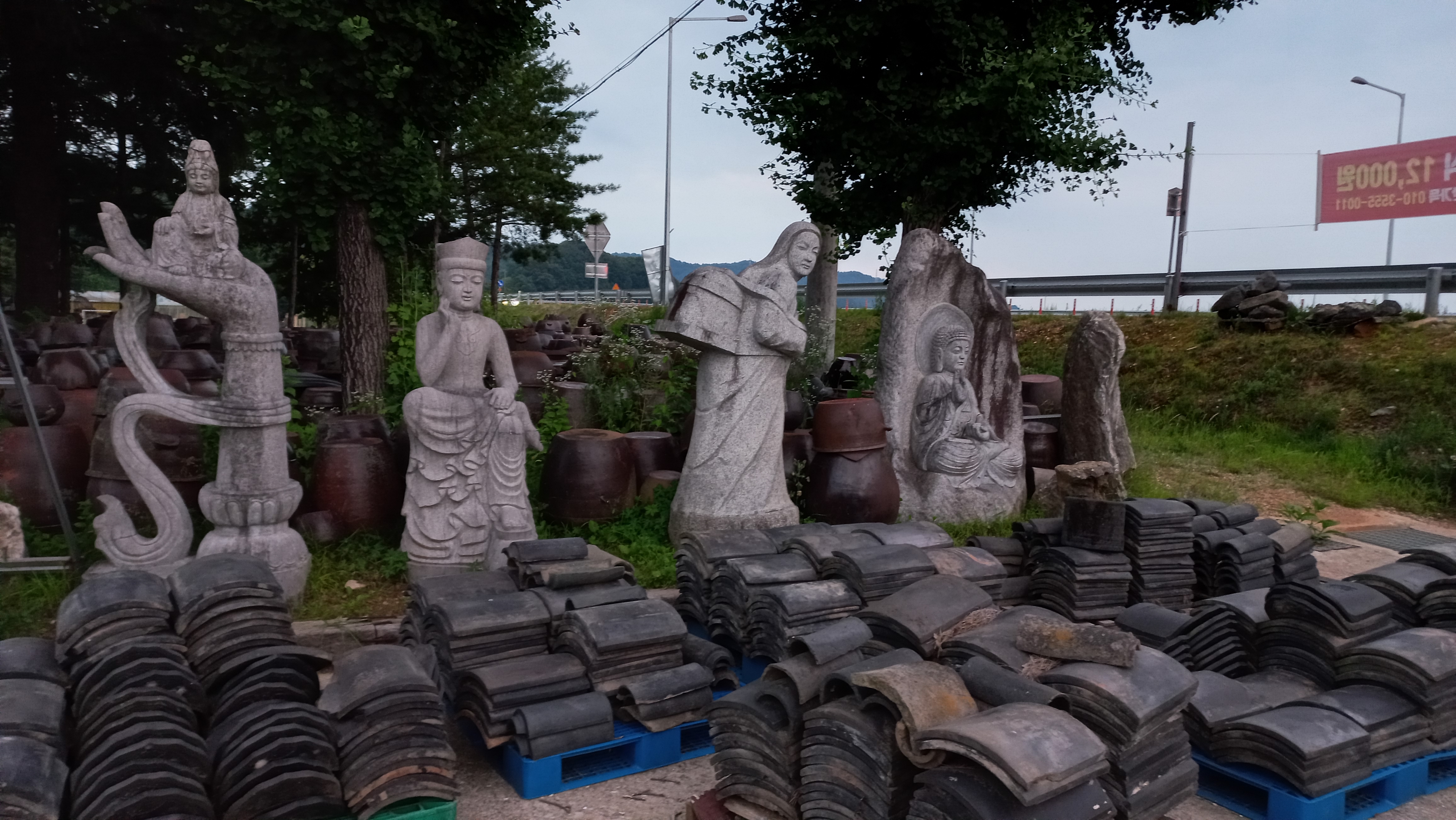 옹기에 한가득 주차장 한켠에는 다양한 조각들이 전시되어 있습니다.