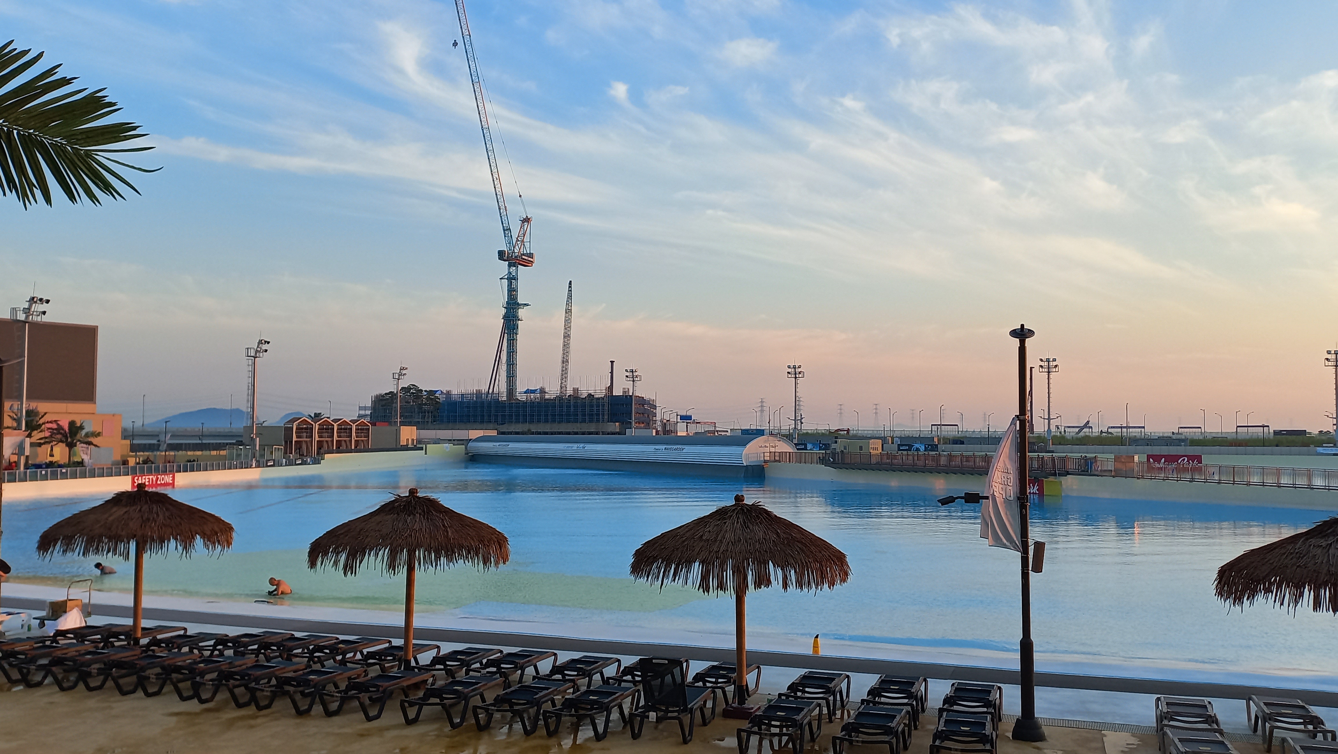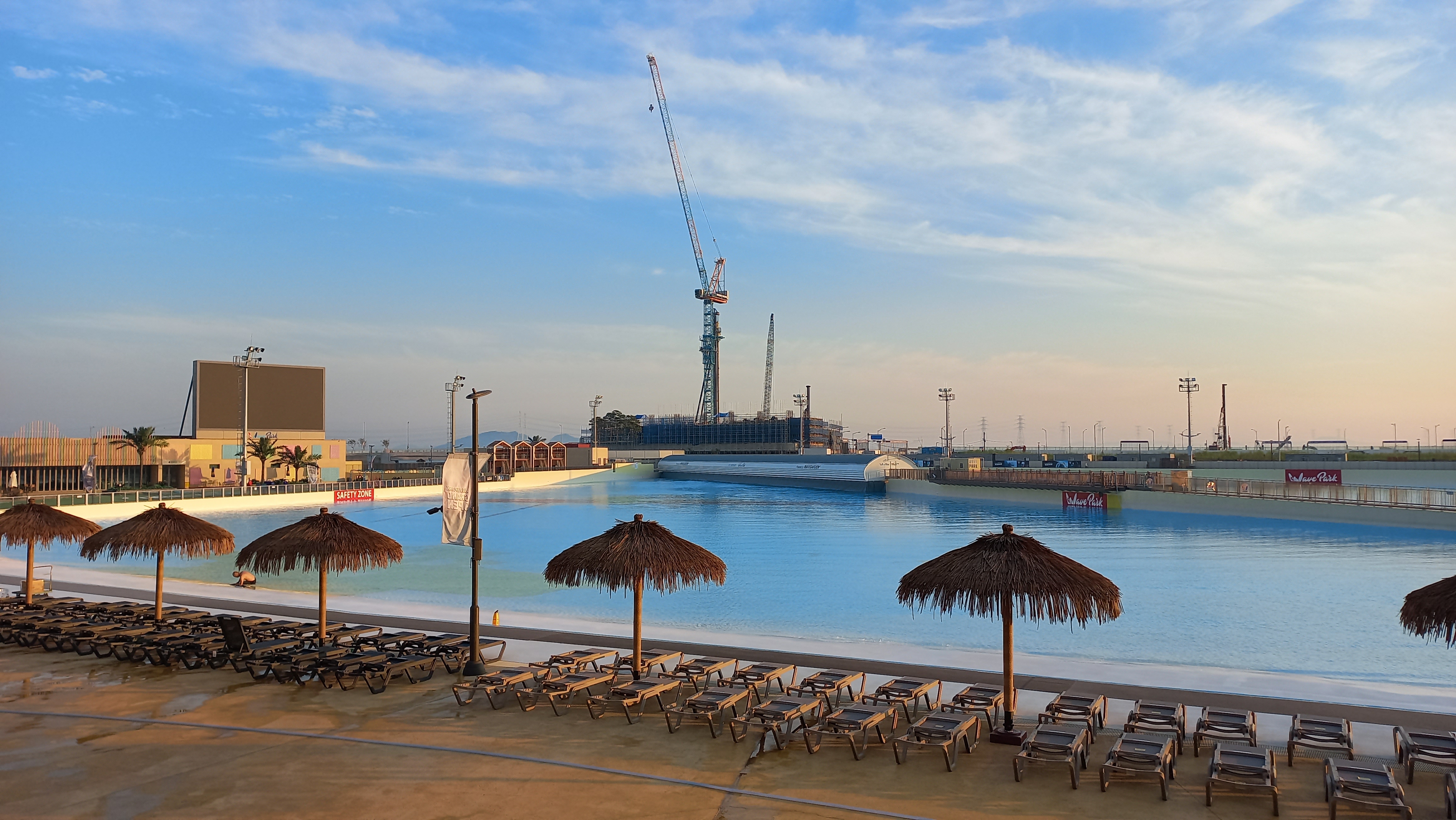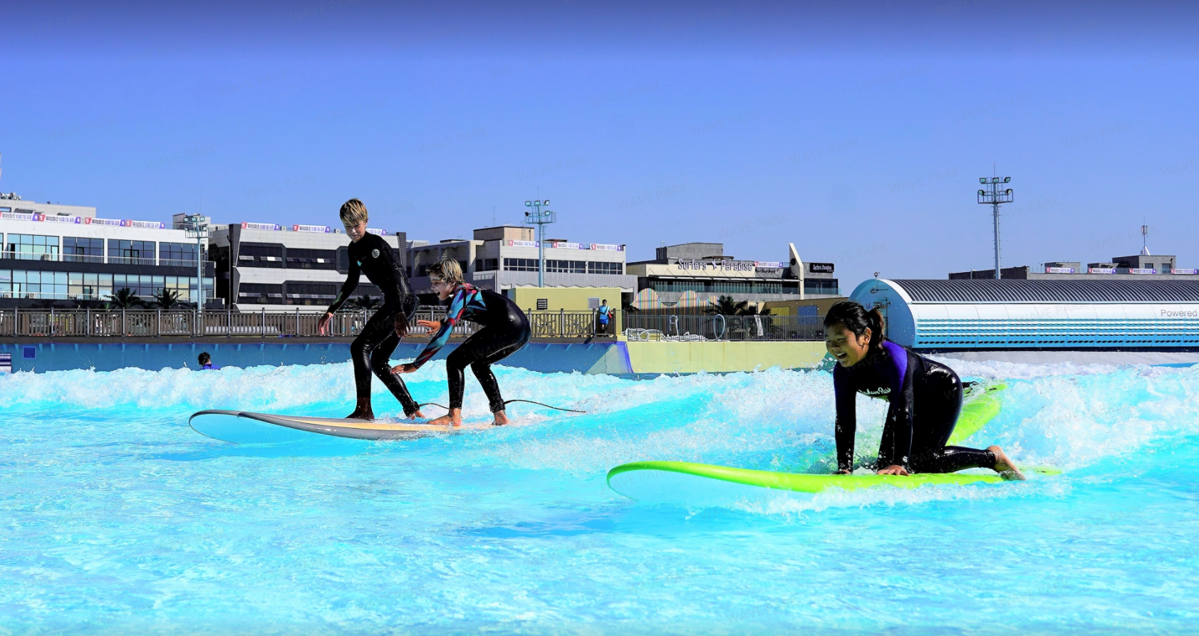 웨이브파크의 인공서핑장은 전체 면적이 16만여㎡, 서핑존은 길이 220m, 폭 240m, 8초에 한 번씩 최대 2.4m 높이의 파도가 쳐, 서핑을 즐기기에는 최적의 조건이라고 합니다.