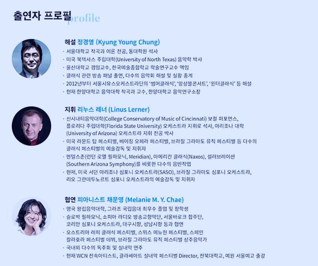 지휘는 미국과 브라질의 심포니 오케스트라 지휘를 하고 있는 리누스 레너 씨였는데, 이번 공연을 위해 2주 간의 자가격리까지 마다하지 않으며 한국을 찾았다고 합니다.