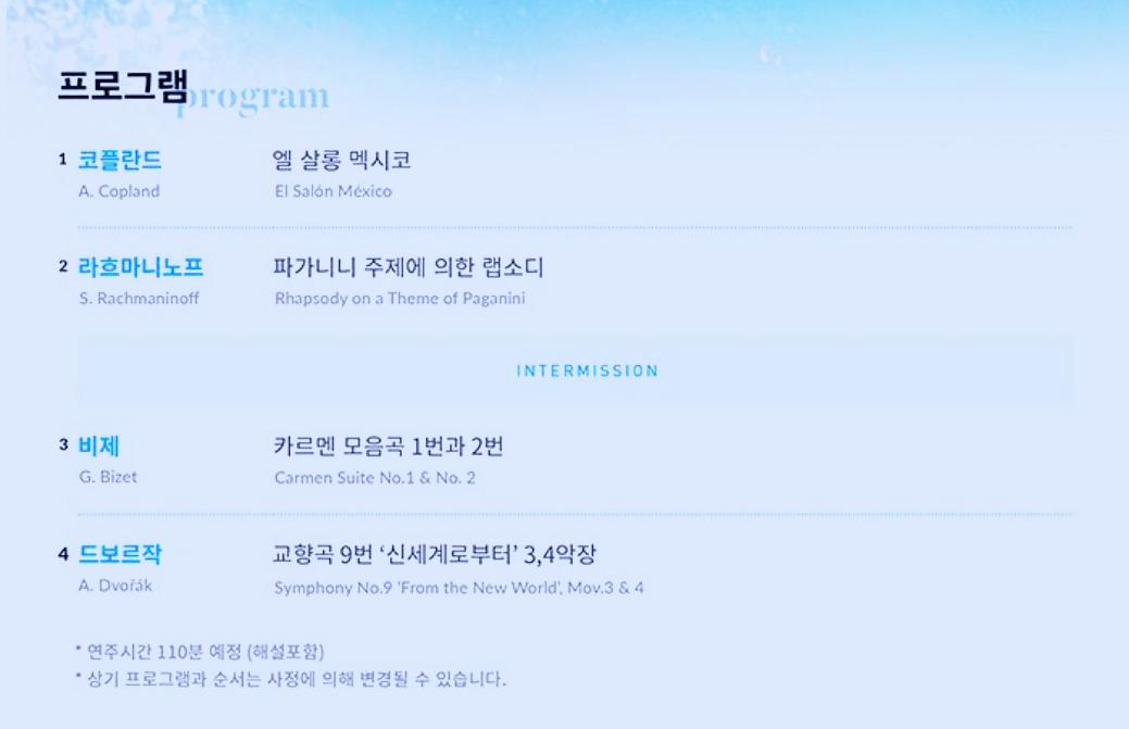 연주된 곡들에 대한 설명은 일부 세종문화회관 사울시유스오케스트라 블로그에서 가져왔습니다.