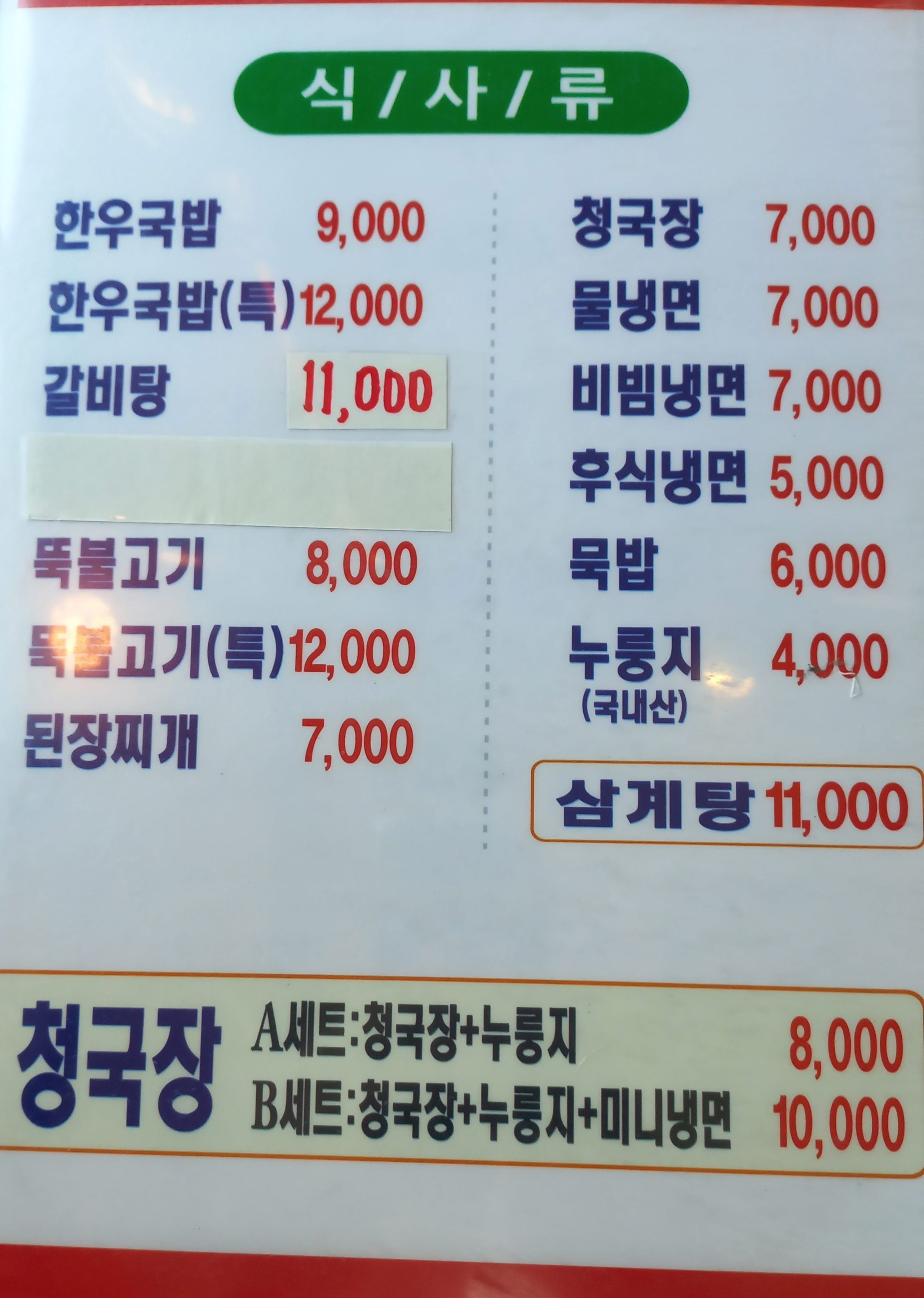정원갈비 메뉴
