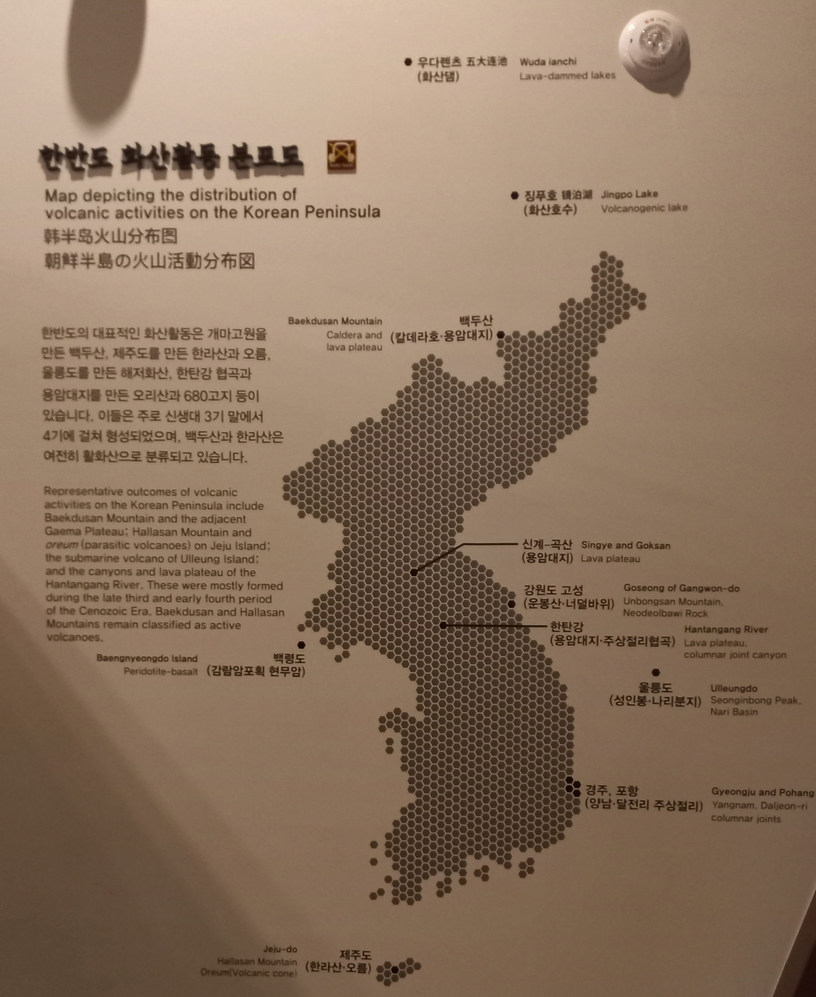 대표적인 화산은 백두산의 개마공원, 제주도의 한라산과 오름들,, 울릉도의 해저화산, 한탄강을 만든 오리산과 680고지 화산 등이네요.