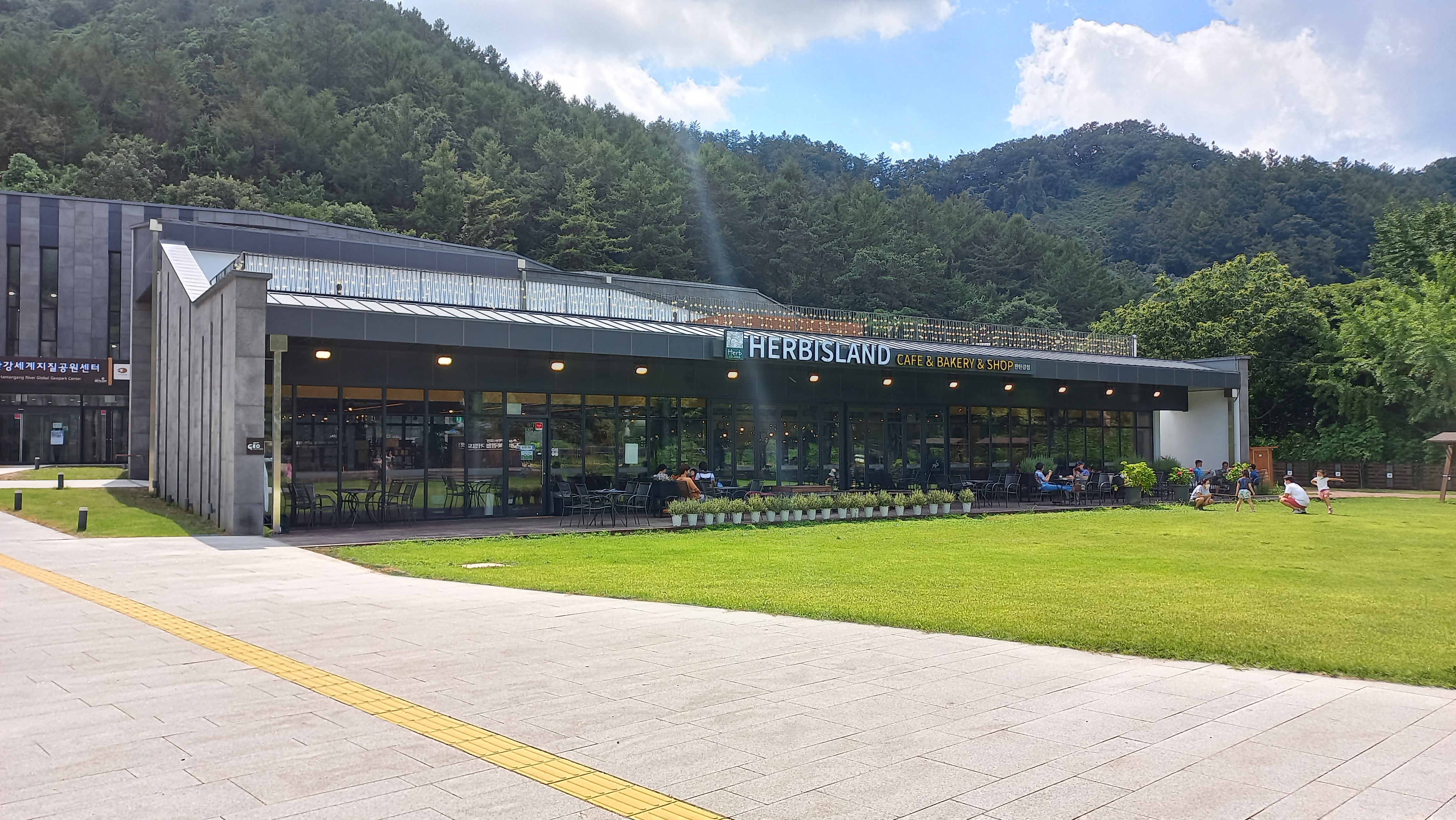 한탄강지질공원센터 옆에는 너른 잔디마당 앞에 카페 허브아일랜드 한탄강점이 있습니다.