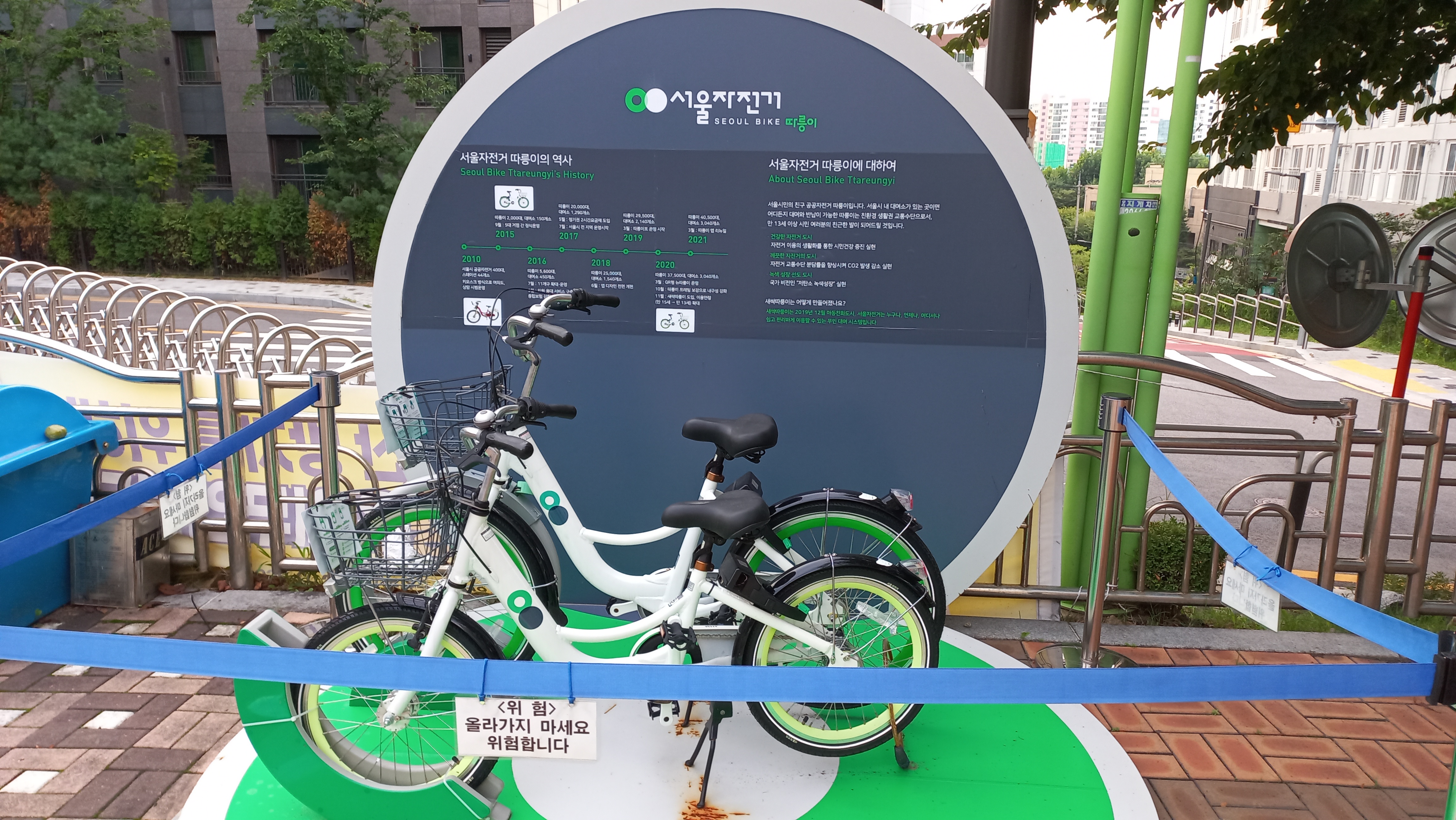 계단을 따라 올라가면 양천구 어린이 교통공원이 있는데, 입구에 서울자전거가 전시되어 있습니다.