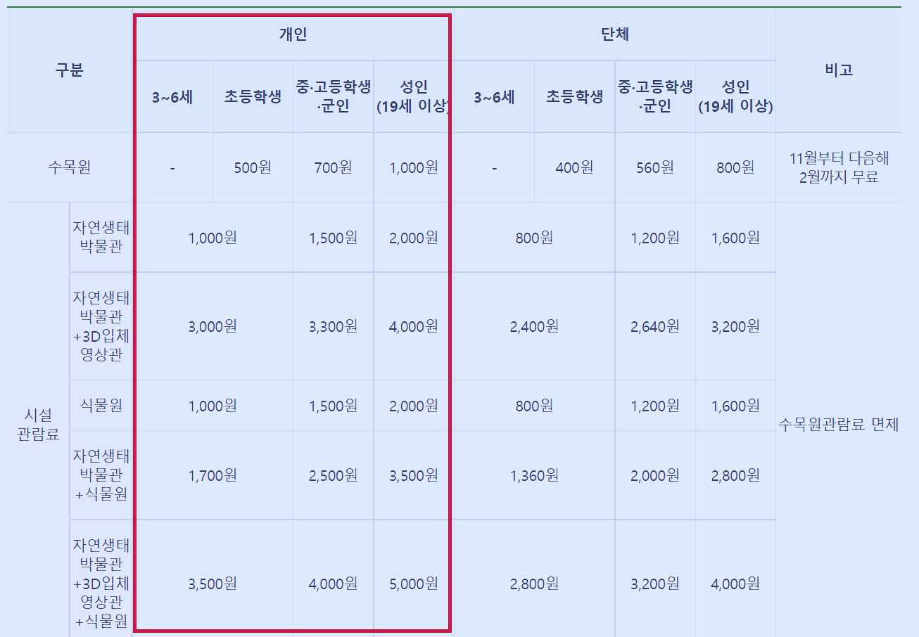 입장하는 시설에 따라 다양한 요금제가 적용되어 부천자연생태박물관 홈페이지 정보를 가져왔습니다.