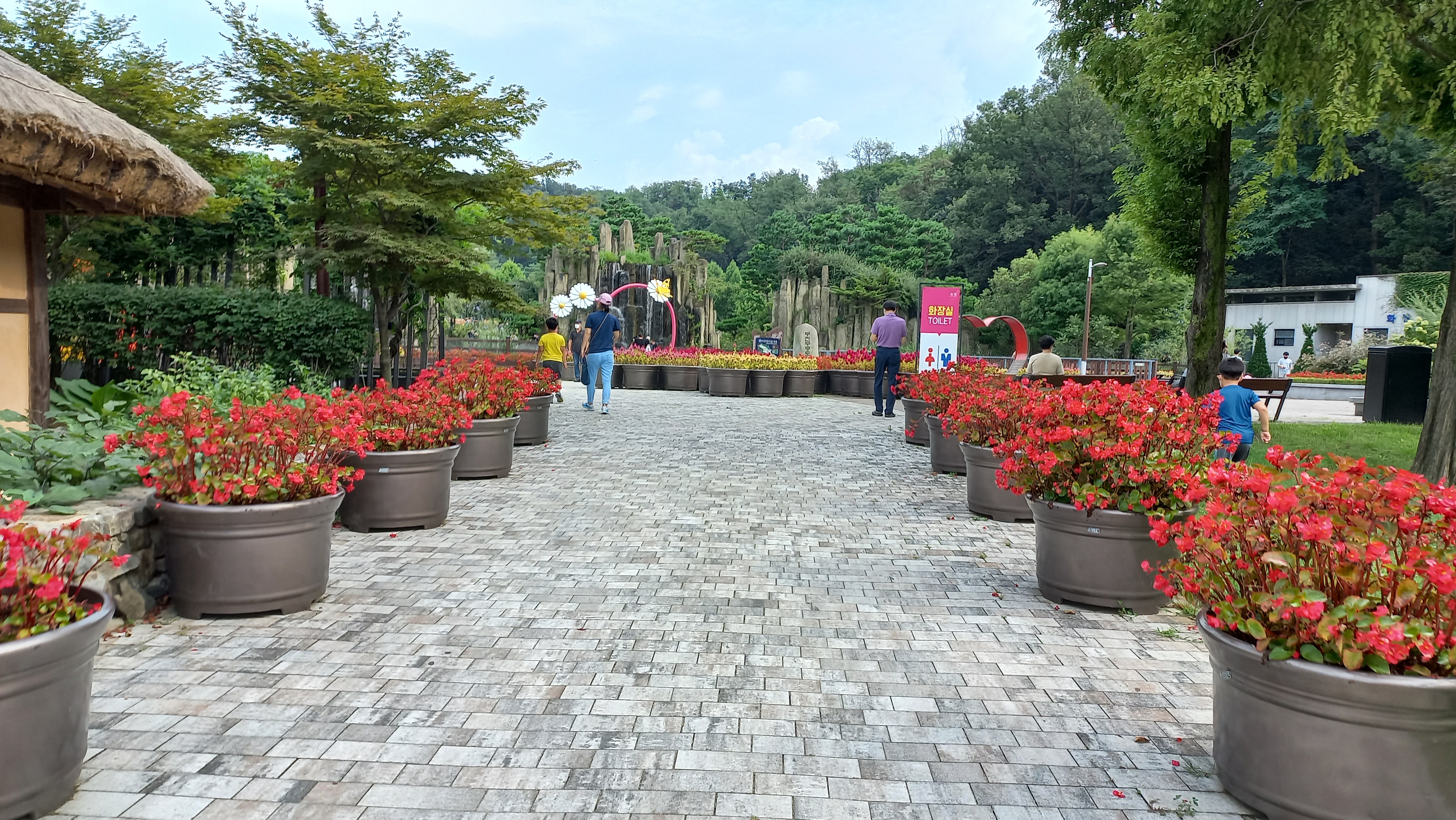 빨간 꽃으로 치장한 무릉도원수목원 입구 모습