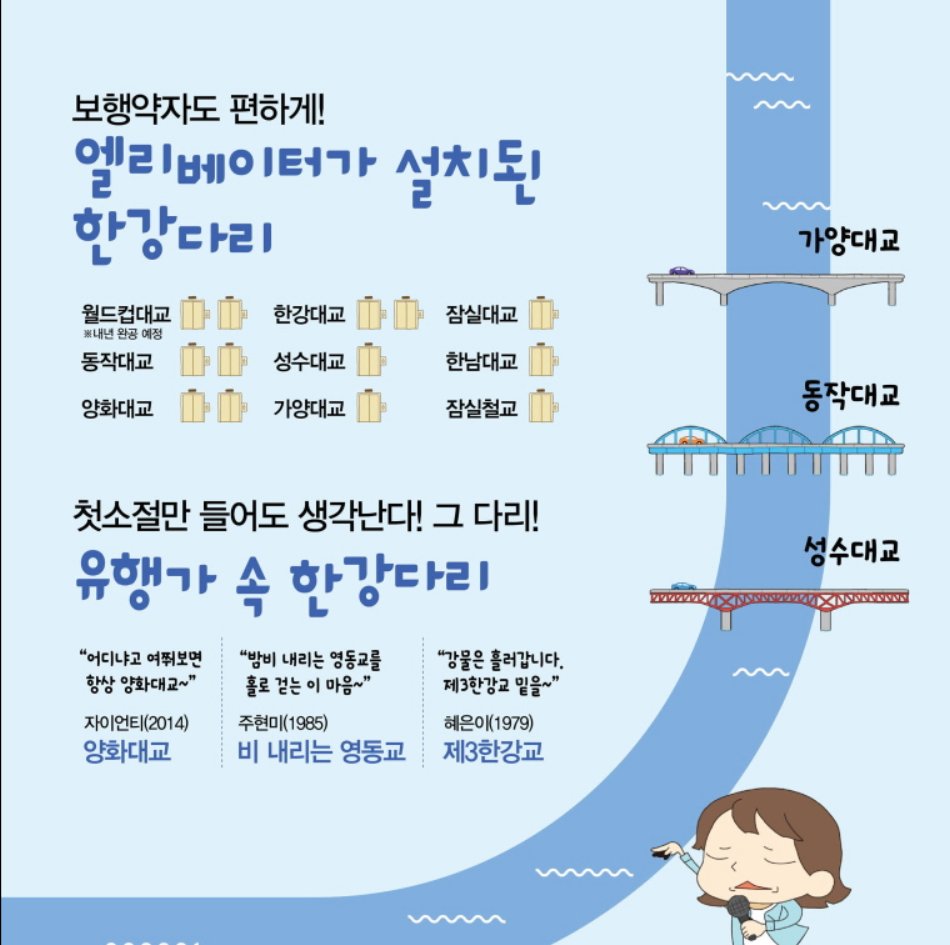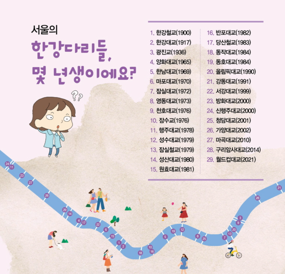 이런 한강을 가로지르는 서울의 한강다리에 대한 TMI가 서울시 내 손안의 서울에 소개되어 흥미롭게 적어 봤습니다.