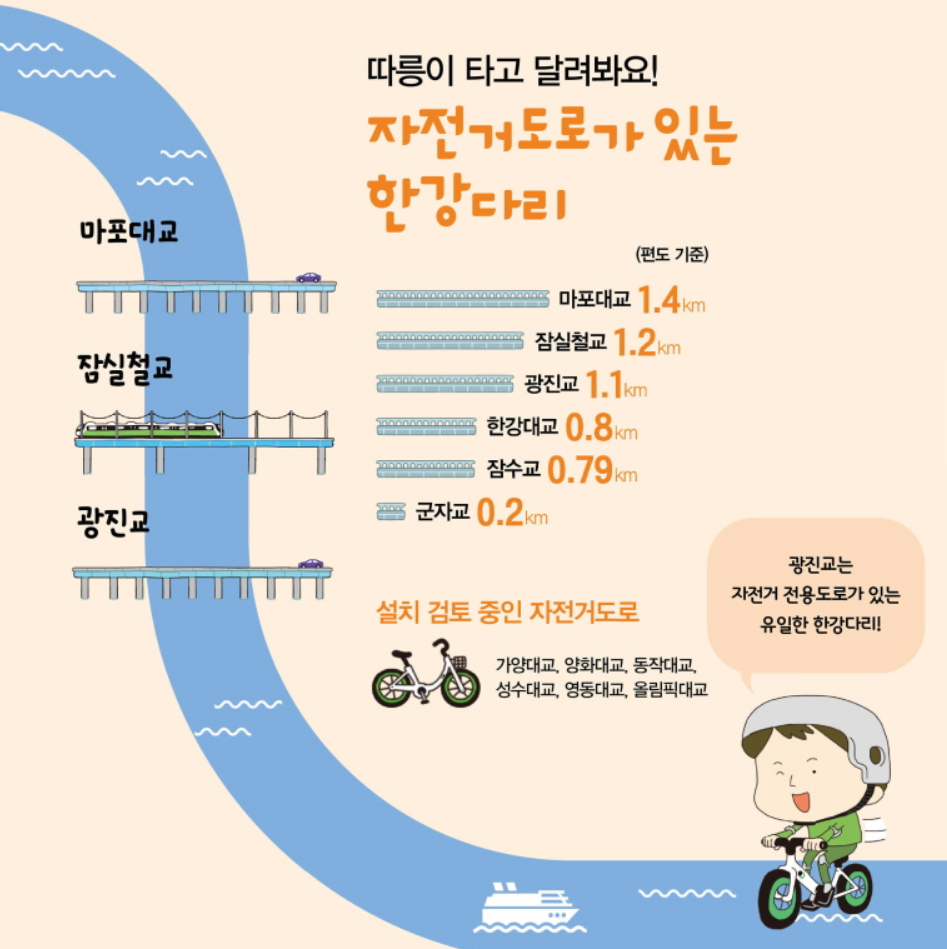 광진교와 월드컵대교는 자전거 전용도로가 있는 유일한 한강다리이며, 앞으로 저전거도로를 설치 검토 중인 한강다리는 가양대교, 양화대교, 동작대교, 성수대교, 영동대교, 올림픽대교 등입니다.