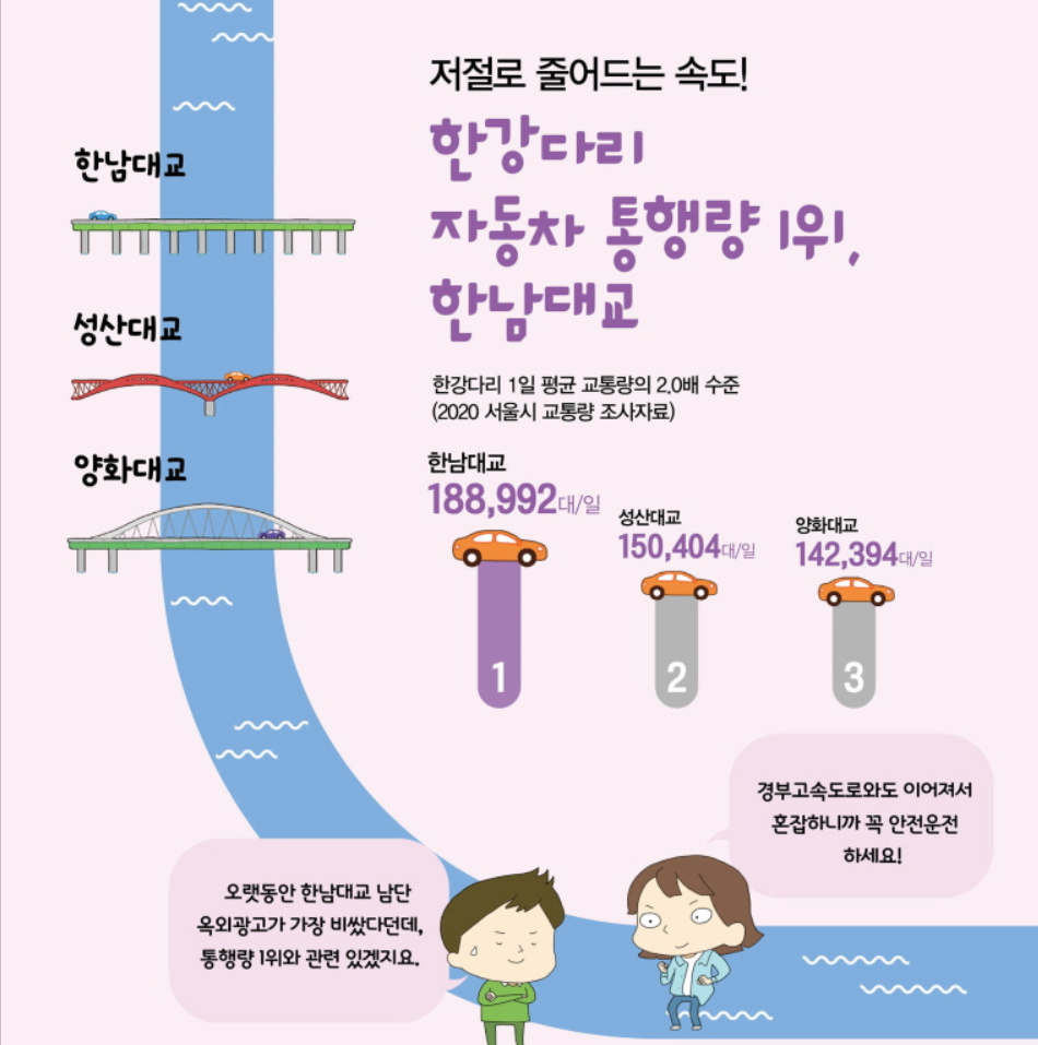 1위 한남대교 188,992대/일, 2위 성산대교 150,404대/일, 3위 양화대교 142,394대/일