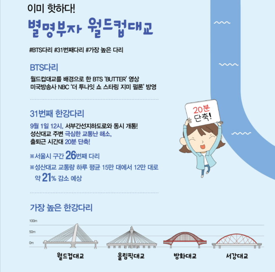 최대 높이의 교량은 최근 개통한 월드컵대교로 주탑 콘크리트 상부 건설을 위해 레미콘 차량 1,700대 분량인 10,000㎥의 콘크리트를 사용했다고 합니다.