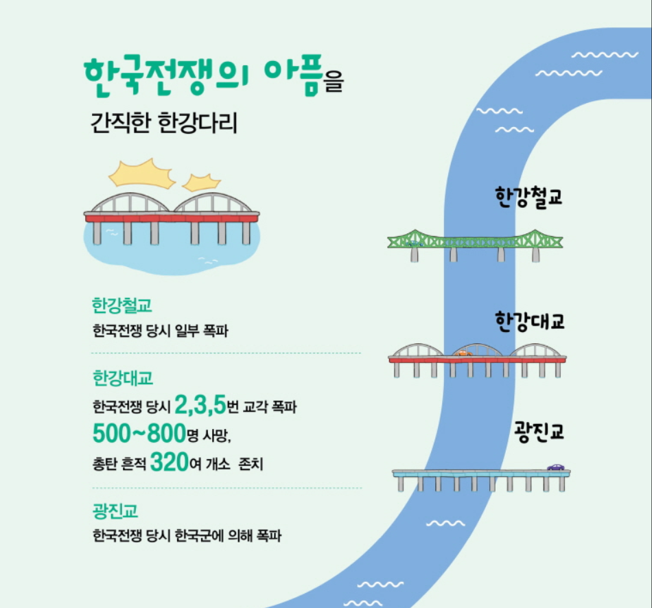 한강대교는 한국전쟁 당시 2,3,5번 교각 폭파로 500~800명이 사망했고, 총탄 흔적도 320여개소가 남아있다고 합니다.
